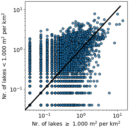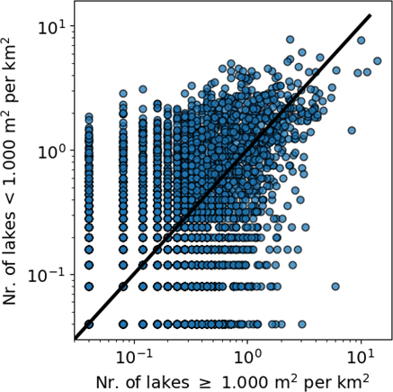 Figure A1Relationship between density of lakes ≥1000 and lakes <1000 m2. The number of lakes refers to the lakes within each 5 km×5 km grid cell, as shown in Fig. 1. The black line represents the 1:1 line.