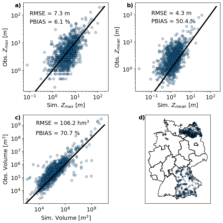 Figure A2Simulated versus observed lake or pond maximum depth (a), mean depth (max. depth by area) (b) and volume (c) for ∼1600 lakes and ponds located in Bavaria and Mecklenburg Vorpommern (d). The black lines in panels (a)–(c) show the 1:1 lines.