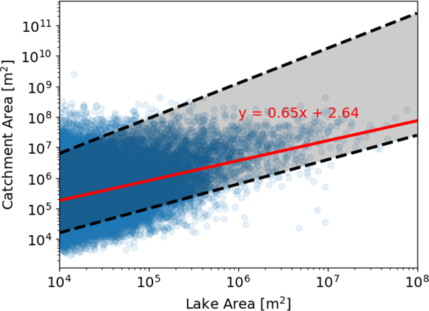 Catchment area is expected to increase linearly or exponentially with lake area in logarithmic space (Walter et al., 2020), which is congruent with the findings in this study (Fig. A3).