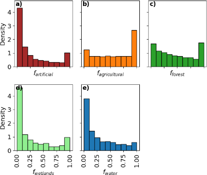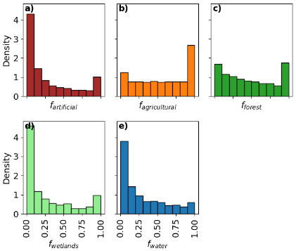 The land cover of the lake's and pond's catchments is heterogeneously distributed between forest, agriculture, and urban areas etc.: 55 % of the catchments have no urban areas, 38 % no forest areas while only 14 % have no share of agriculture within their catchment (Fig. A4). On average, the catchments are covered by 50 % agricultural areas, 39 % forested areas, 10 % urban areas, 2 % wetlands, and 6 % water bodies.