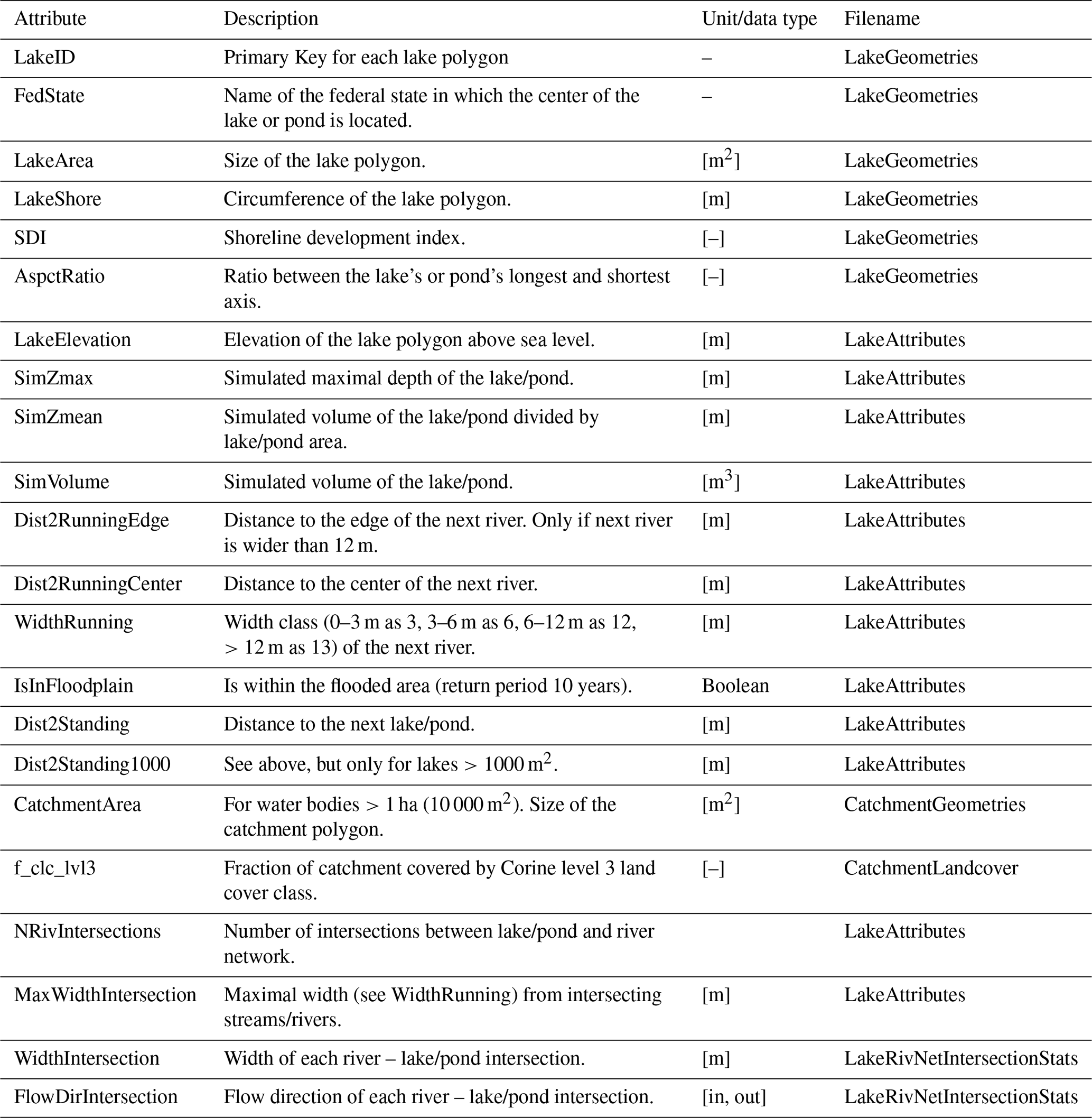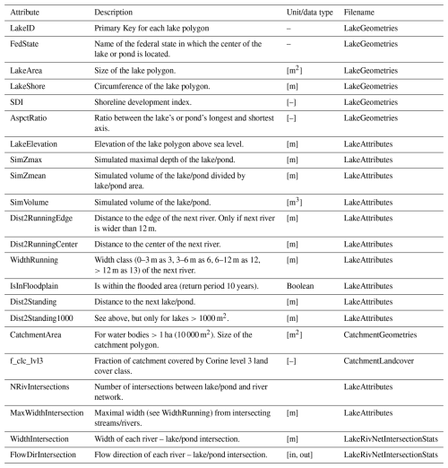 Table 1Short description of all attributes derived for the lake/ponds, including their storage location in the database.