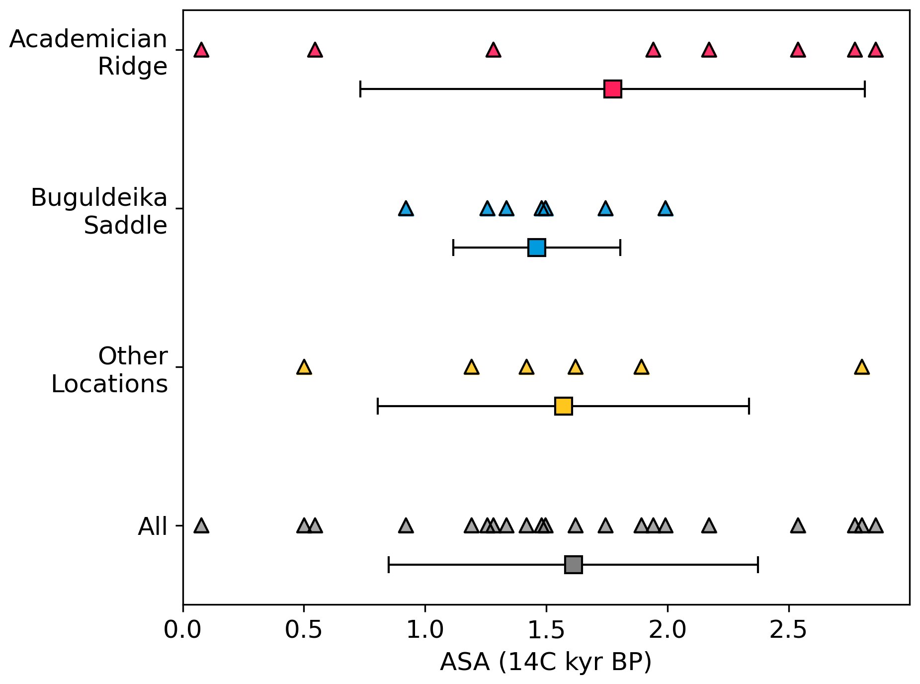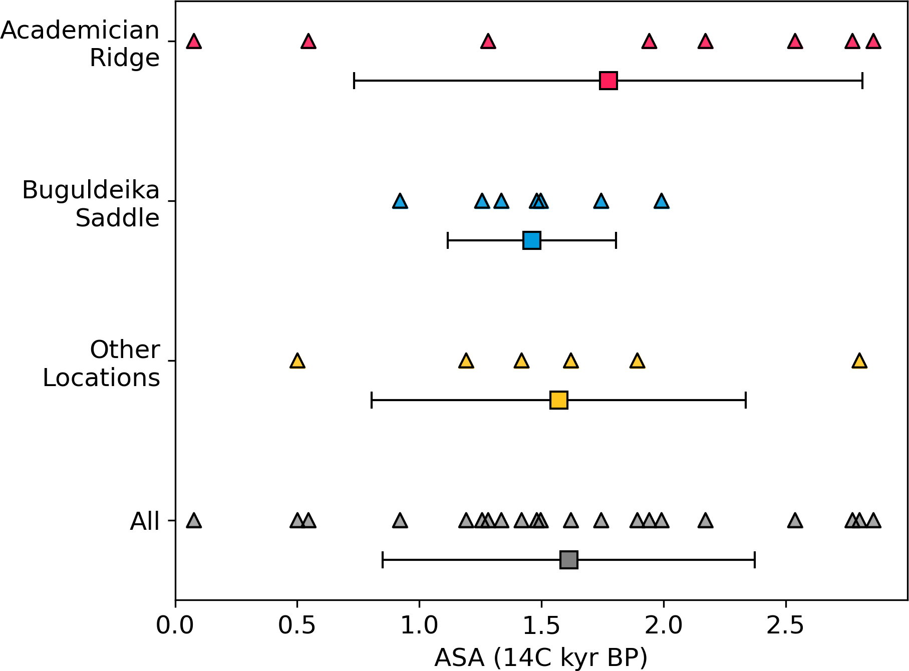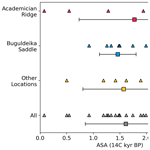 Figure 5Individual ASA estimates (triangles) grouped as being either from Academician Ridge, Buguldeika Saddle, or other locations. The mean of each location is denoted as a square and the standard deviation is illustrated with symmetrical error bars. Estimates from all locations are then considered as a single group (“All”, in grey), showing the mean and standard deviation.