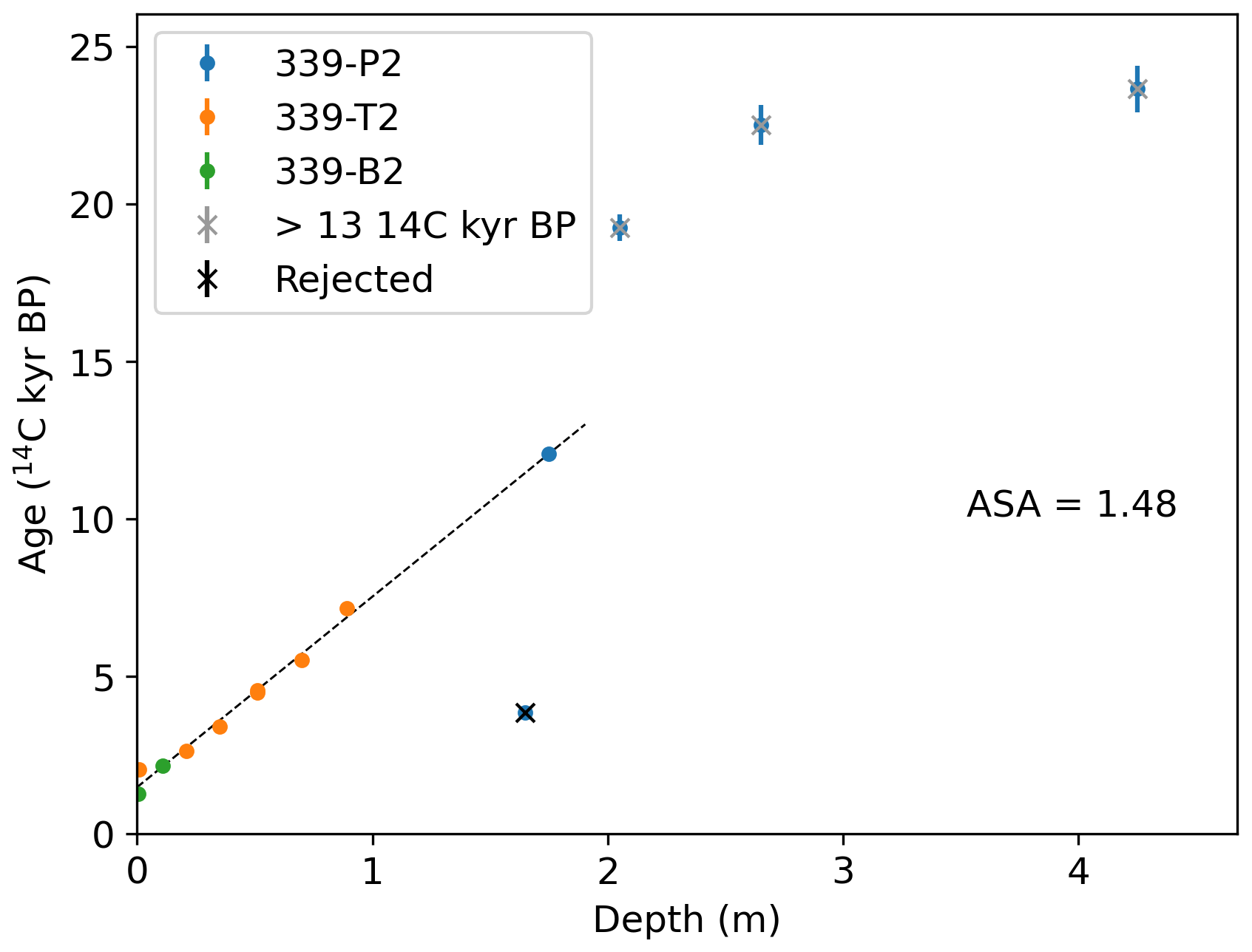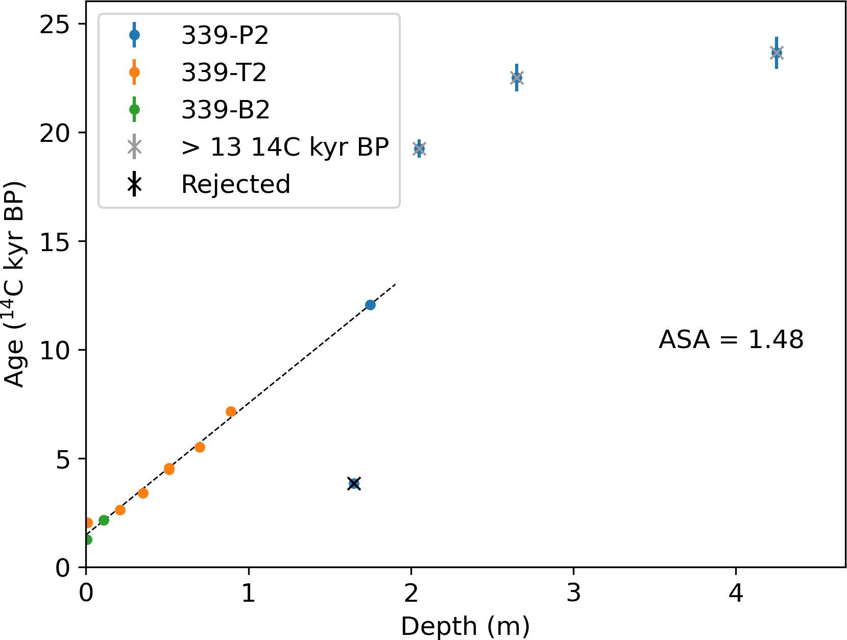 Figure 1An example of the creation of composite cores using cores from the same drilling site, following Colman et al. (1996). The radiocarbon ages (all from TOC) from cores 339-B2, 339-T2 and 339-P2 are plotted against depth forming a composite core from Site 339. Circles show the mean radiocarbon age and bars show the analytical 1σ uncertainty. Ages that are rejected or not used in the linear regression are overlain with a black or grey cross respectively. The rejected ages shown here follow the interpretation of Colman et al. (1996), and those older than 13 14C kyr BP are not used in the linear regression. The black dotted line shows the linear regression (only shown up to 13 14C kyr BP). The y-intercept, or ASA, is 1.48 14C kyr BP. In our interpretation of this core, we additionally rejected the 2nd deepest date from 339-P2 (the single blue dot in this figure), because all other ages from this core seem problematic. Both interpretations return an ASA of 1.48 14C kyr BP.