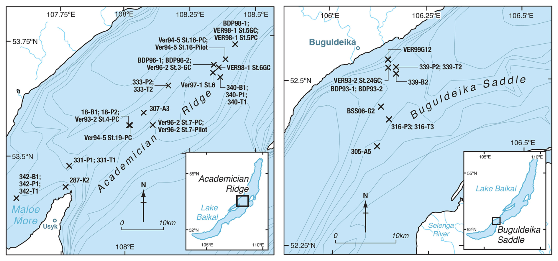 To aid the reader in finding the locations of cores in the densely cored regions, we provide higher resolution maps of Academician Ridge and Buguldeika Saddle (Fig. 3).