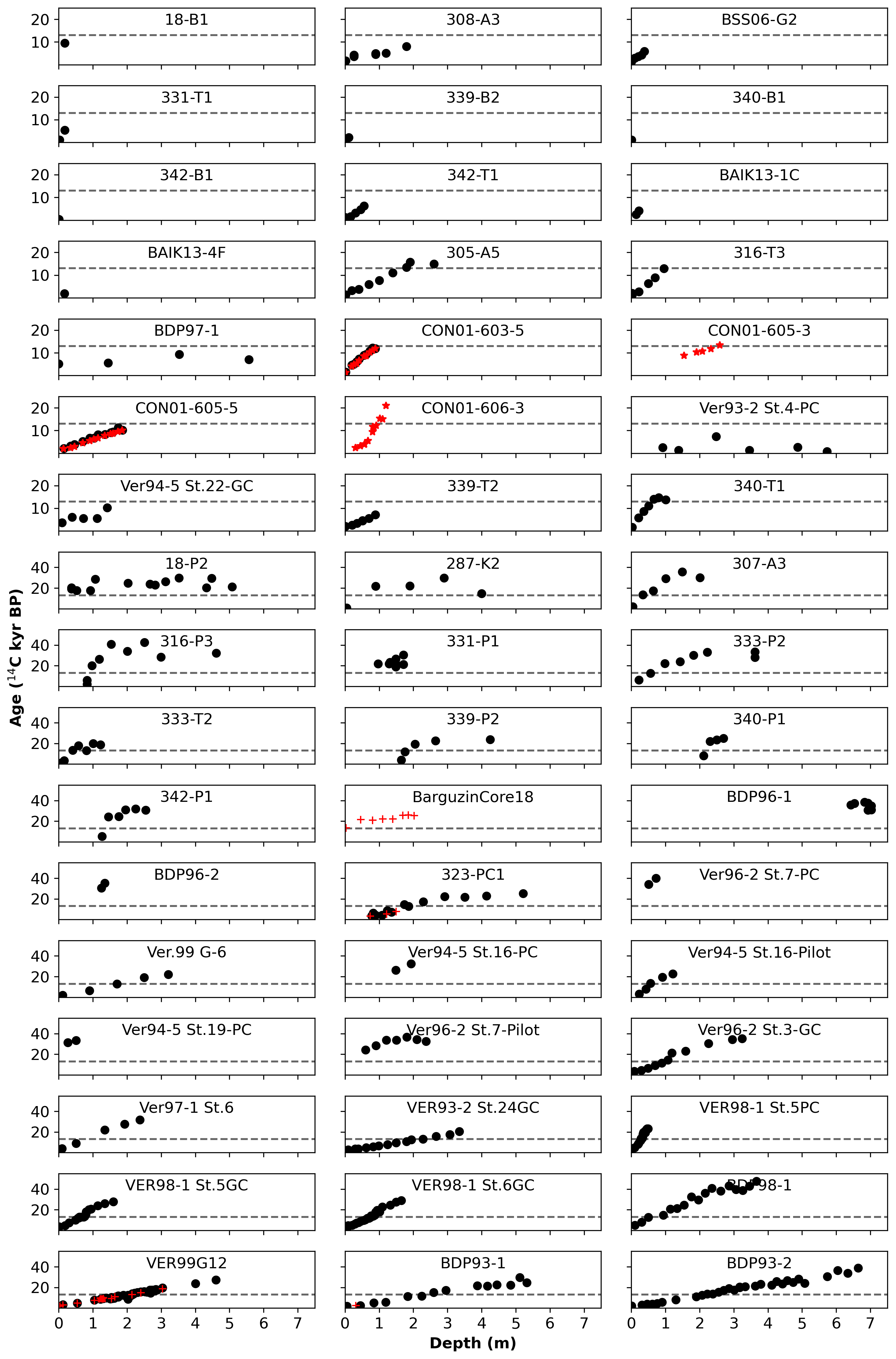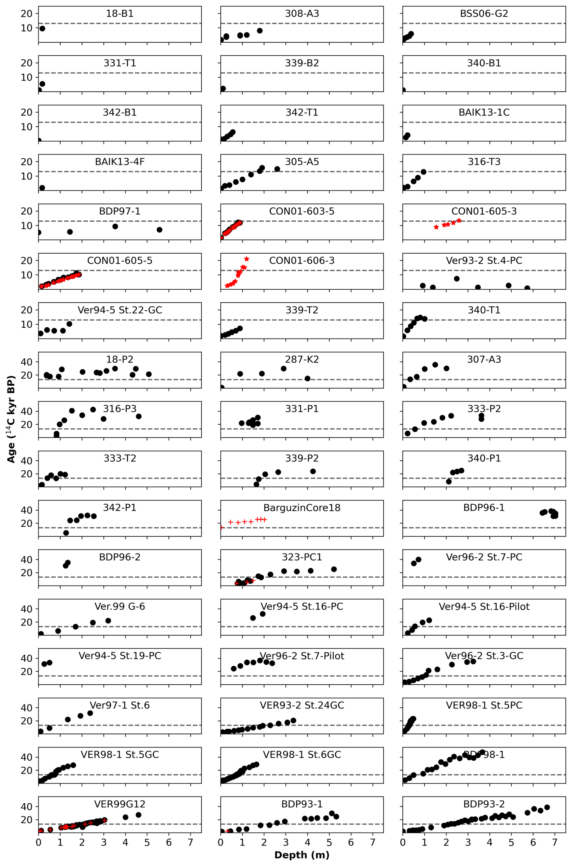 Figure 4Radiocarbon data from all 51 cores in this database, with mean uncalibrated radiocarbon age in 14C kyr BP on y axis and depth in m plotted on x axis. TOC ages are shown as black dots, pollen ages as red stars, and all other materials (lipids, diatom/pelitic silt, wood) are shown as red crosses. The top seven rows have smaller y axis limits to better show shorter cores. All x axes are the same. Horizontal dashed lines are plotted at 13 14C kyr BP to highlight the cut-off for our linear regression method.