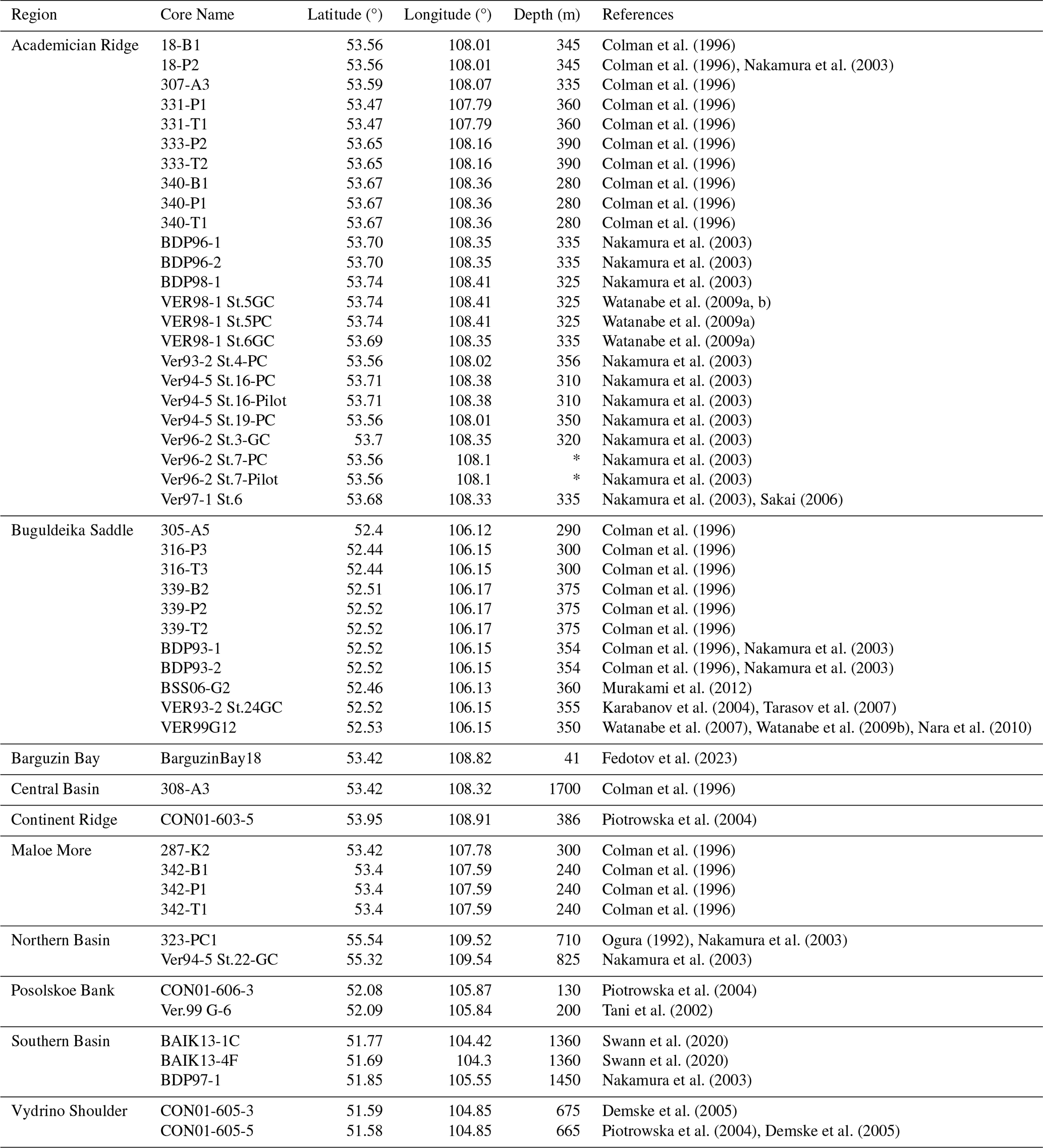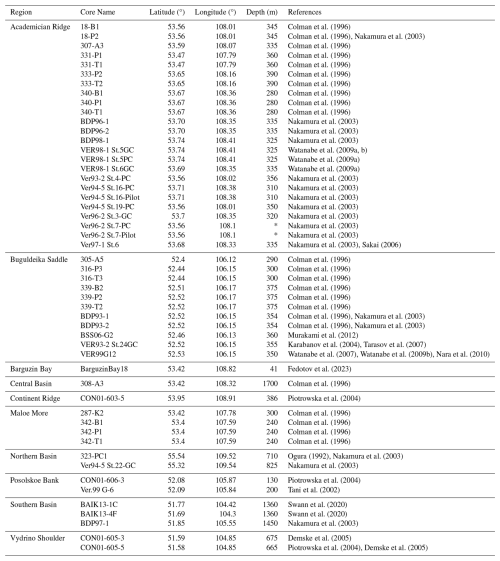 The location data provided for core CON01-603-5 by Piotrowska et al. (2004) and for core 287-K2 by Colman et al. (1996) placed the cores outside the boundaries of the lake. The location of 287-K2 was corrected by sight to match the locations provided on the map figures of Colman et al. (1996) and the location of CON01-603-5 was revised to fit that of Demske et al. (2005). Numerous slightly differing location data for BDP96-1 and BDP96-2 were found (Kashiwaya et al., 2001; Nakamura et al., 2003; Sakai et al., 2000), being 20 km apart at most. We use the value from Nakamura et al. (2003). Note, latitude/longitude data for core Ver97-1 St.6 was only found to the precision of degree minutes, not degree seconds (Sakai, 2006).