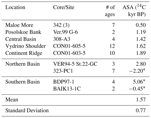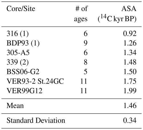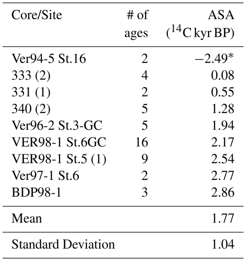 Table 2The ASAs (14C kyr BP) for each core/site at Academician Ridge. Where cores were analysed as a composite, the number of cores from which data was used in the linear regression is denoted in parentheses. Cores with anomalous ASAs are marked with *.