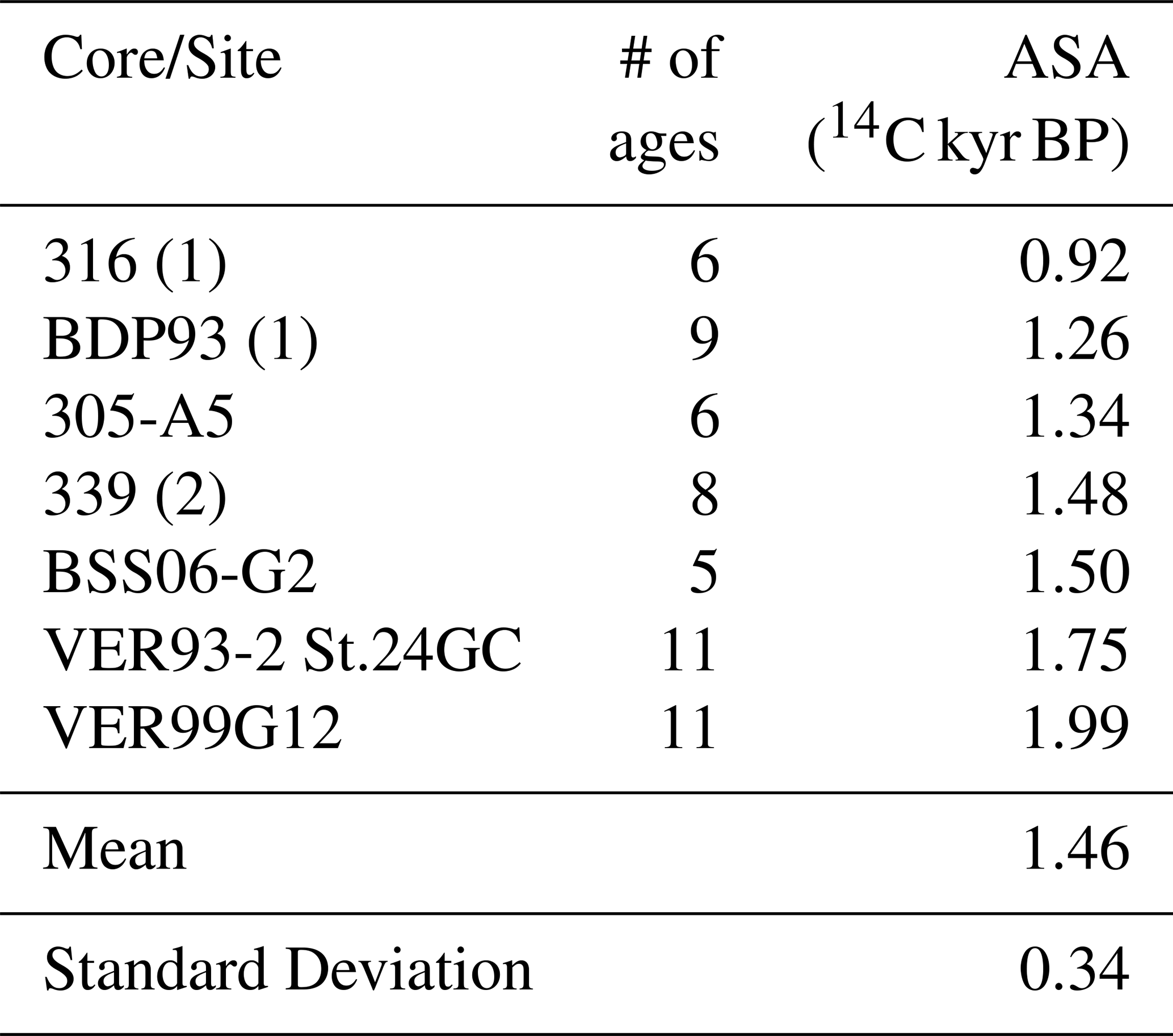 The ASA of 9 sites, using 11 cores, were returned from Academician Ridge (Table 2). Core Ver94-5 St.16 returned a negative age offset estimate and we consider it an outlier, leaving 8 accepted ASAs. Cores 18-P2 and 18-B1 were left out as the former was non-linear and the latter only had one age. Core 340-P1 was left out because its only age younger than 13 14C kyr BP was a large reversal from the older ages of 340-T1 and was clearly erroneous. Core 307-A3 was left out because it only had one age younger than 13 14C kyr BP. Cores 331-P1, Ver94-5 St.19-PC, Ver96-2 St.7-Pilot, Ver96-2 St.7PC, BDP96-1, and BDP96-2 were left out because they had no ages younger than 13 14C kyr BP. Core Ver98-1 St.5PC seems to have suffered from partial compression (clear from comparison to Ver98-1 St.5GC; Watanabe et al., 2009a) so was left out.