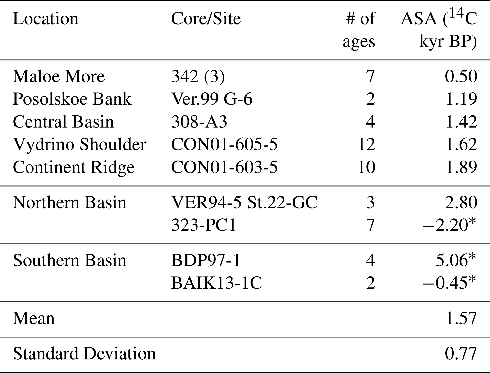 Table 4The ASAs (14C kyr BP) for each core/site in other regions. Where cores were analysed as a composite, the number of cores from which data was used in the linear regression is denoted in parentheses. Cores with anomalous ASAs are marked with *.