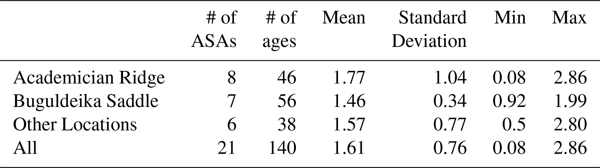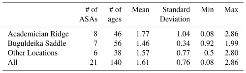 Our results have a mean and standard deviation of 1.61 ± 0.76 14C kyr BP (Table 5; Fig. 5). The median estimate is similar to the mean, at 1.50 14C kyr BP and a Shapiro-Wilk test returns a p-value of 0.69, suggesting it would be reasonable to consider the results normally distributed. The means for Buguldeika Saddle, Academician Ridge, and for all other locations are similar to the mean of the entire lake (Fig. 5). The minimum and maximum ASA estimates are 0.08 and 2.86 14C kyr BP respectively, both from Academician Ridge, providing a very large range. The Buguldeika Saddle region provides a much less variable set of ASA estimates than Academician Ridge.