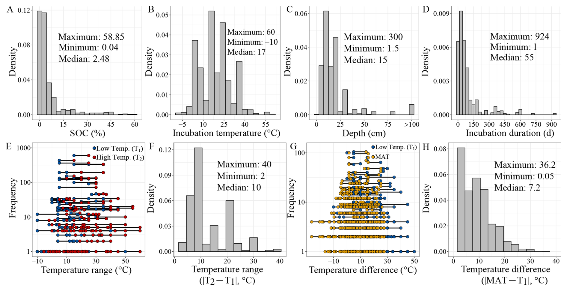 Temperature sensitivity is typically assessed via either field or laboratory incubation experiments. Field studies reflect in situ conditions but are confounded by numerous environmental variables (e.g., plant inputs, soil moisture variability), and it is difficult to separate root and microbial respiration. Moreover, field measurements are challenging to conduct continuously, especially in remote ecosystems. Laboratory incubations, while simplified and often subject to preparation artifacts (e.g., sieving, drying, rewetting), offer controlled conditions that isolate specific mechanisms and allow for systematic comparisons across soils and temperatures (Zhang et al., 2020). Importantly, although many laboratory studies have yielded mechanistic insights, they are often limited in spatial scope or designed to test specific hypotheses. Yet, taken together, the body of global incubation data represents an underutilized resource for addressing broad-scale questions about SOC temperature sensitivity.