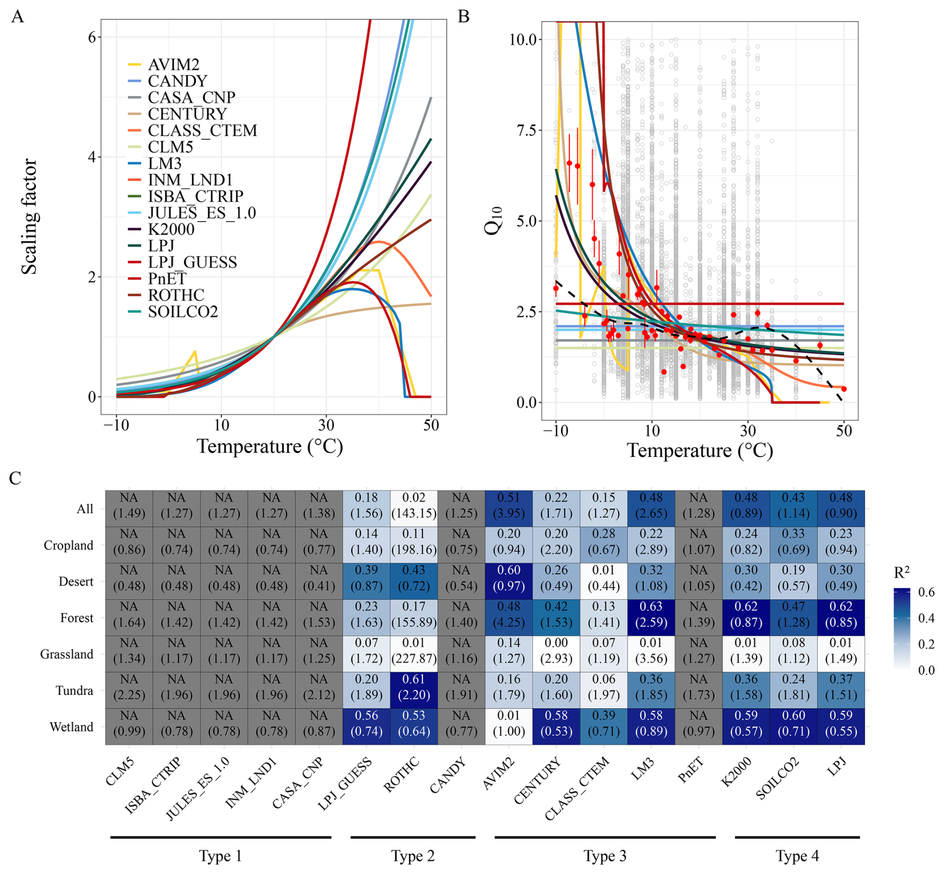 Taken together, our results highlight that: (1) no single temperature response function captures Q10_obs variability across all ecosystems and temperature ranges; (2) simple and hybrid exponential functions show relatively robust performance, particularly in cropland, grassland, and forest soils; (3) high-latitude, subsoil, and high-temperature responses remain poorly constrained due to data limitations; (4) expanding observational datasets across diverse ecosystems – especially in extreme environments – is essential for improving the realism and generalizability of temperature response functions in ESMs. Ultimately, our comparison provides a benchmark for refining temperature sensitivity formulations in soil carbon models, emphasizing the need for ecosystem-specific calibration and incorporation of nonlinear temperature effects to reduce uncertainty in future carbon–climate feedback projections.