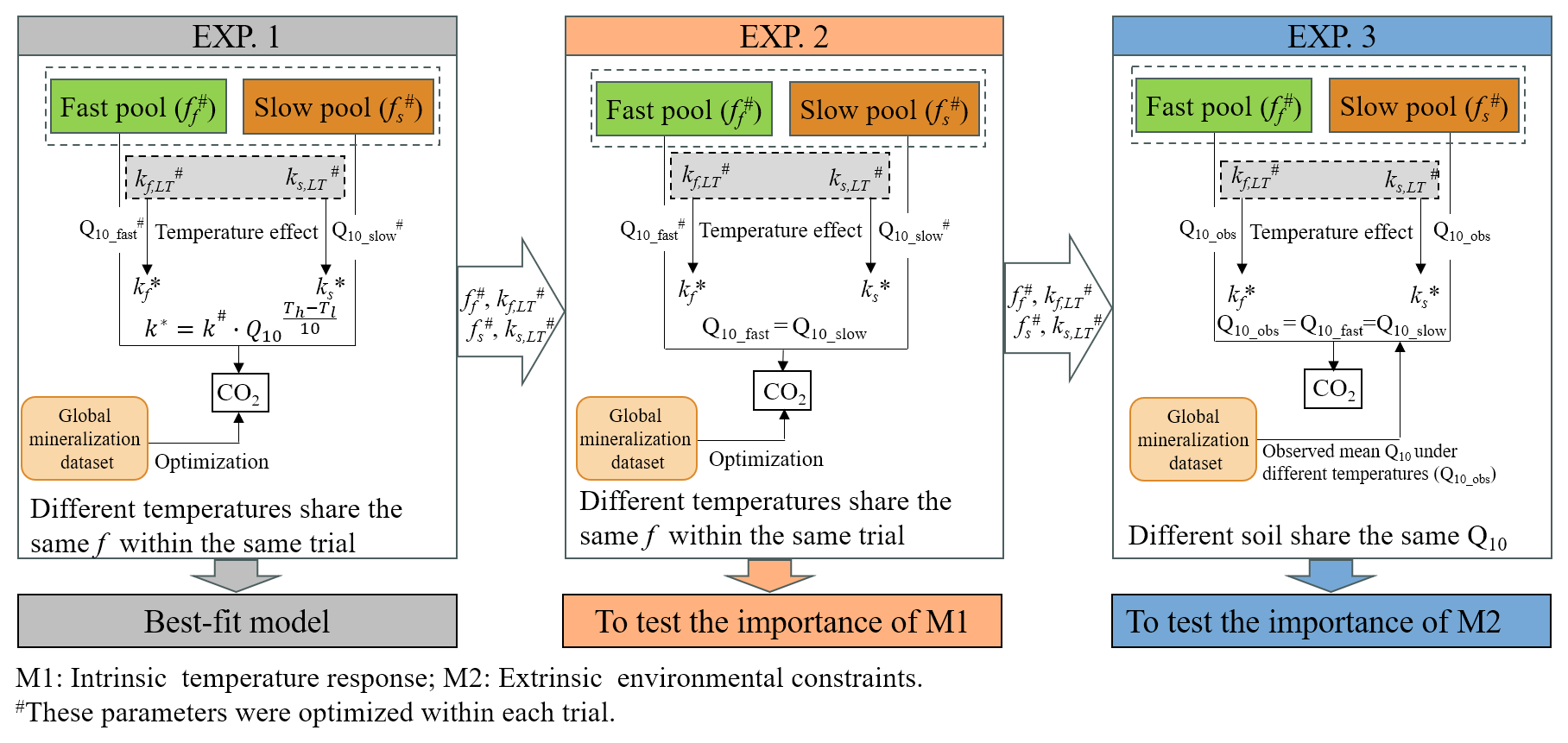 Figure 4The data-model integration framework to distinguish the importance of intrinsic temperature responses and extrinsic environmental constraints. The framework illustrates the data-model fusion process employed to verify the regulatory mechanisms underlying the temperature sensitivity of soil organic carbon mineralization. M1, intrinsic temperature response, associated with the chemical decomposability of SOC pools and the thermal traits of microbial communities; M2, extrinsic environmental constraints, referring to factors such as mineral associations, aggregate occlusion, moisture limitation, and oxygen availability that restrict microbial access to otherwise decomposable organic matter. kf,LT and ks,LT represent the decomposition rates (d−1) of the fast (ff) and slow (fs) carbon pools, respectively at the lowest incubation temperature within the same trial. Q10_fast and Q10_slow are the temperature sensitivity of fast and slow carbon pools, respectively. Th and Tl denote the higher and lower incubation temperature, respectively. In EXP. 1, kf and ks at the lowest temperature of each trial were optimized and then were scaled to other temperatures using Q10_fast and Q10_slow, which were also optimized. The pool size (f) and decomposition rates (kf and ks) at the lowest temperature from EXP. 1 were applied in EXP. 2 and 3.