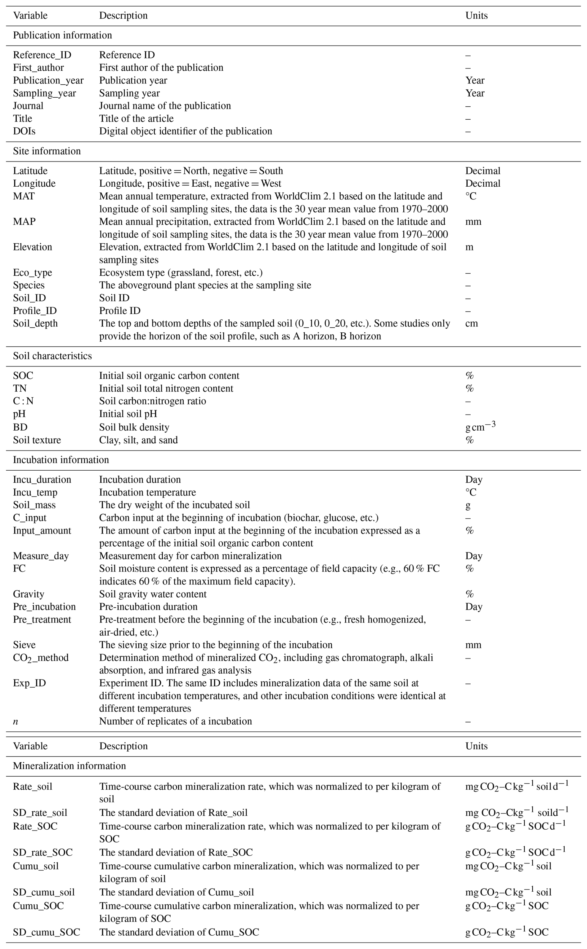 When available, numerical data were directly extracted from the publications, and graphical data were digitized using the WebPlotDigitizer (Burda et al., 2017). SOC mineralization rates were standardized to and . Cumulative mineralization was also recorded as g CO2–C kg−1 SOC and g CO2–C kg−1 soil, corresponding to the total mineralized carbon over the duration of the incubation. We also compiled ancillary information when available, including soil properties (e.g., pH, total nitrogen (TN), carbon-to-nitrogen ratio (C : N), soil bulk density (BD), and texture), site characteristics (geographic coordinates and ecosystem type), and experimental design (incubation temperature, duration, moisture condition, and pretreatment) (Table 1). Based on the recorded geographic coordinates of sampling locations, we extracted 19 climate variables from WorldClim V2.0 at a spatial resolution of 1 km2 (Fick and Hijmans, 2017). All complied data are deposited to https://doi.org/10.6084/m9.figshare.25808698 (Zhang et al., 2025) and are publicly accessible.