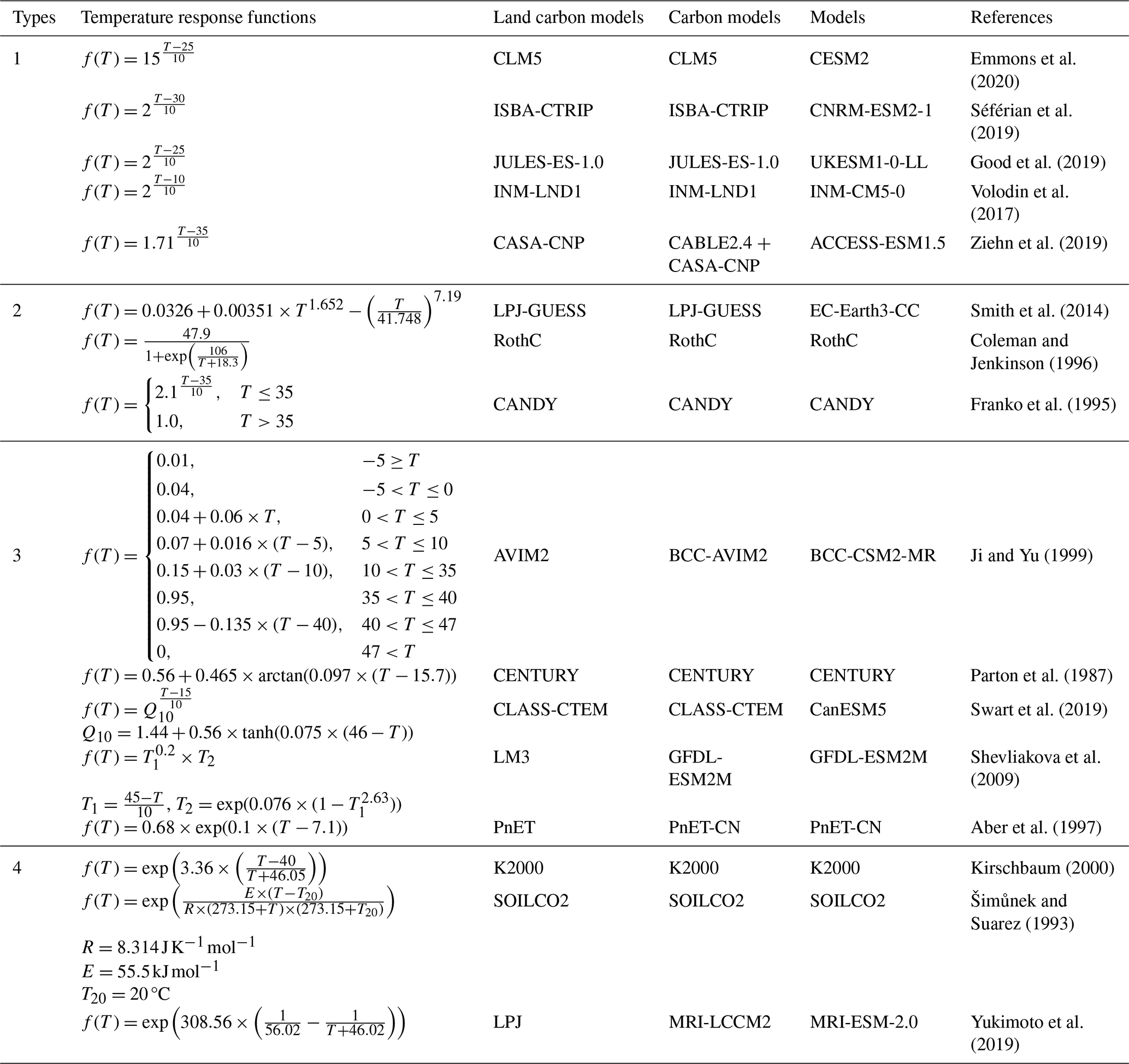 Table 2Temperature response functions used in 69 carbon models. Q10_mod was estimated based on its definition, using the following equation: . Carbon models simulate carbon cycling process and, in some cases, the associated energy and water exchanges, while land carbon models are their submodules specifically representing terrestrial carbon cycling processes.