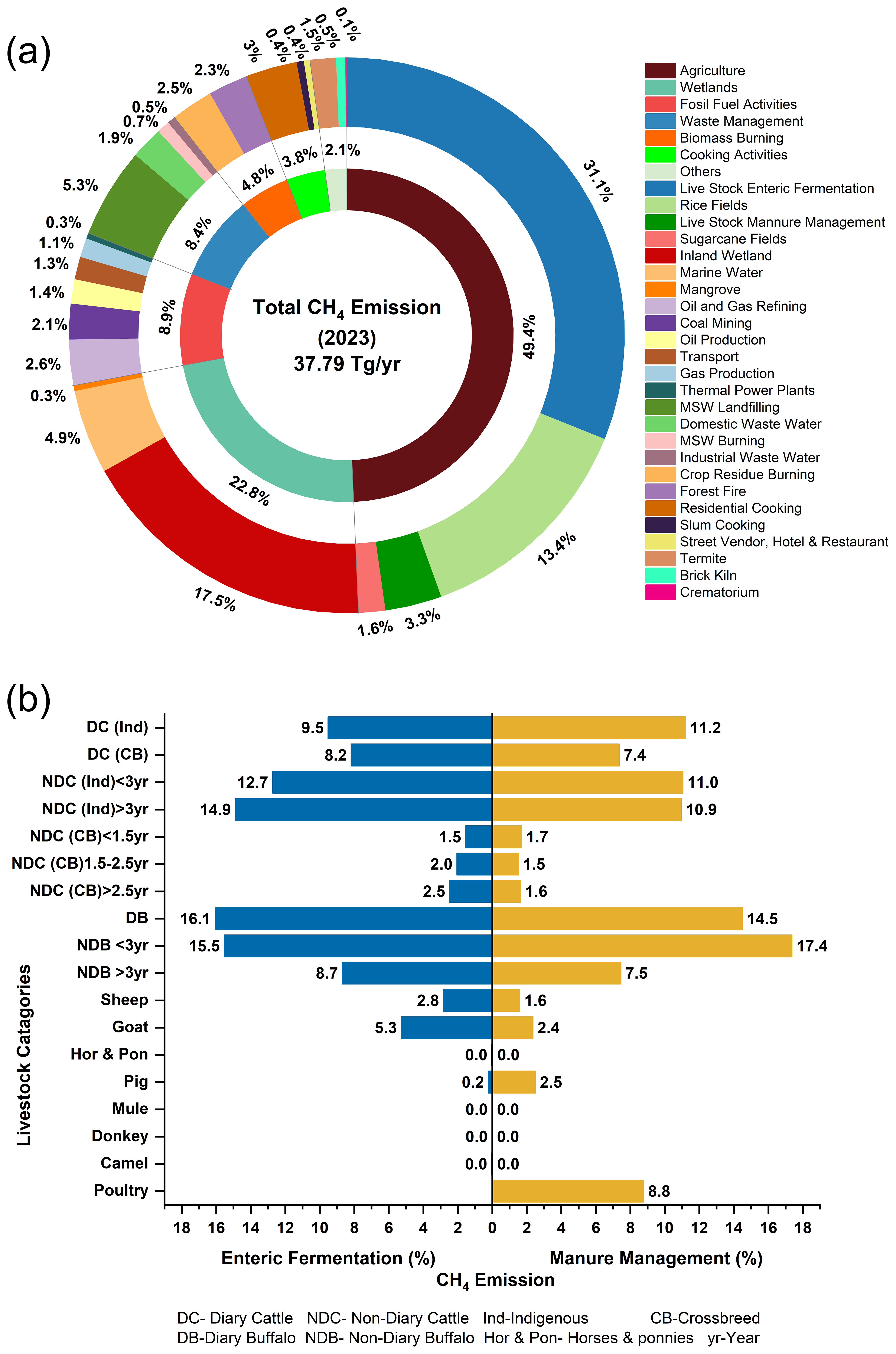 The total methane emissions, estimated from 25 types of sources (natural and anthropogenic) in India, is ∼ 37.79 Tg yr−1 in 2023. The agricultural sector, encompassing both livestock and crop fields, emerged as the predominant contributor, accounting for nearly half (∼ 49 %) of the nation's methane emissions. Specifically, livestock enteric fermentation alone is responsible for approximately one-third of agricultural sector emissions, while rice crop fields contributed about 13 %. Wetlands constituted the next significant source, contributing more than one-fifth (8.6 Tg yr−1) of the national total. This is followed by emissions from fossil fuel-based activities, which accounted for approximately 9 % (3.35 Tg yr−1), waste management (∼ 8 %), biomass burning (∼ 5 %), cooking activities (∼ 4 %), and other miscellaneous sources comprising about ∼ 2 % of the total emissions, as illustrated in Fig. 1a.