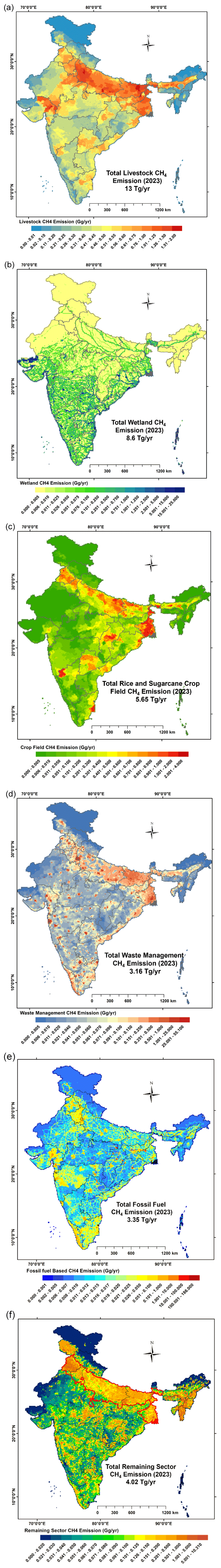 Figure 2Sectoral methane emission from India in 2023 (a) Livestock, (b) Wetland, (c) Rice and Sugarcane Crop Field, (d) Waste Management, (e) Fossil Fuel based Activities, (f) Remaining sector.