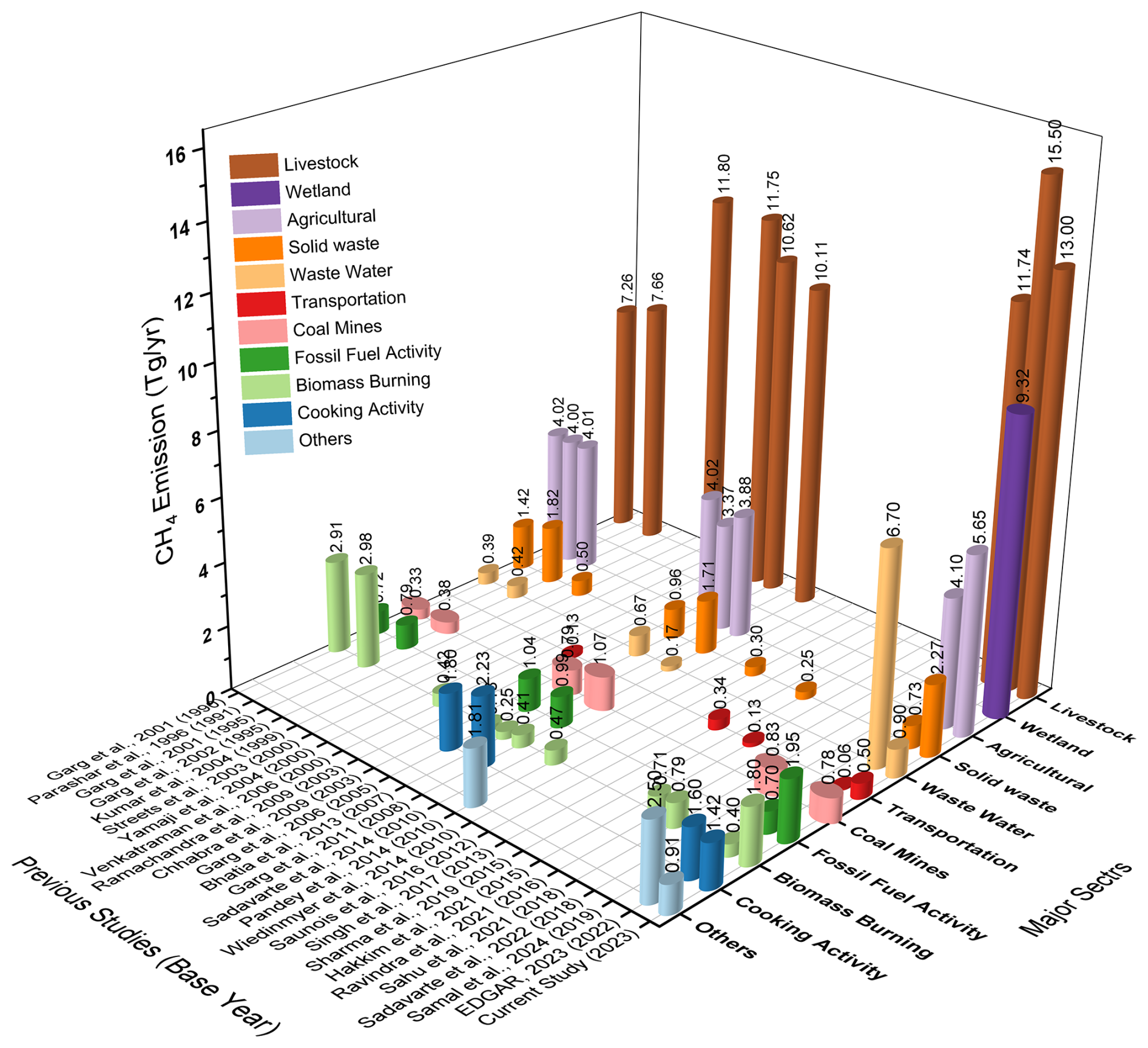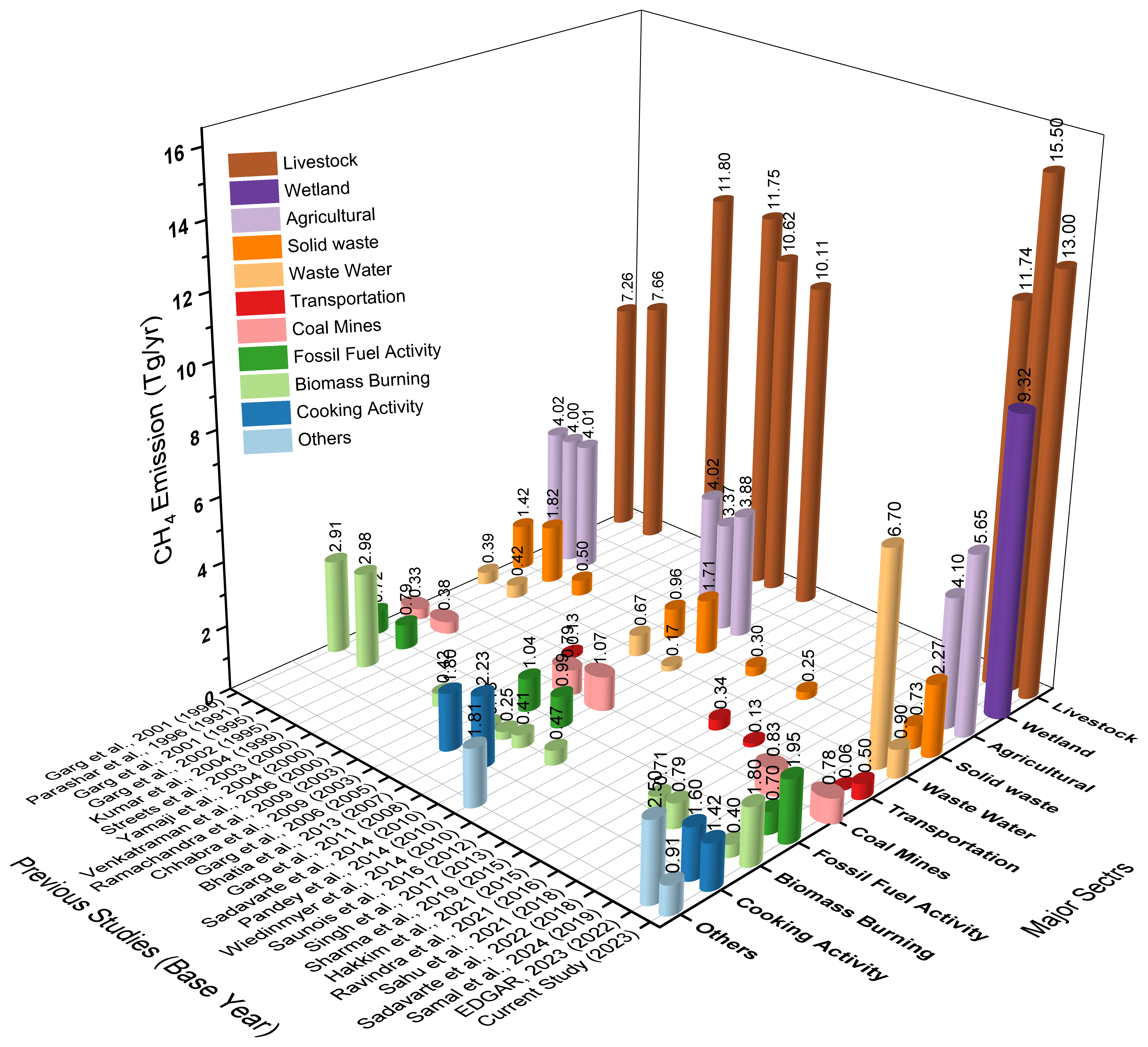 In the current study, methane emissions from waste management are found to be substantial, with 2.27 Tg yr−1 attributed to moderate solid waste management, including both open waste burning and landfilling, and 0.9 Tg yr−1 from the treatment of residential and industrial wastewater. By contrast, the EDGAR (2023) reports significantly higher emissions from wastewater at 6.7 Tg yr−1, yet lower rate from solid waste at 0.73 Tg yr−1. This discrepancy may stem from differences in the scope and methodologies employed in estimating emissions from urban versus rural waste management practices. Garg et al. (2011, 2006) reported methane of 1.71 and 0.96 Tg yr−1 from solid waste, and 0.17 and 0.67 Tg yr−1 from wastewater for the years 2008 and 2005, respectively. Although these figures are lower than those reported in the current study, they suggest a consistent trend in the contribution of waste management to methane emissions over time. In the fossil fuel sector, including emissions from coal mining, the current study estimates methane at 1.95 Tg yr−1, with 0.78 Tg yr−1 specifically attributed to coal-mines. In comparison, EDGAR (2023) reports a lower total of 0.7 Tg yr−1 from fossil fuel activities, suggesting potential underestimation or differences in methodologies used to account for fugitive emissions. Garg et al. (2011, 2006) reported 1.07 and 0.79 Tg yr−1 of methane emissions from fossil fuels, in the respective studies, which are lower figures but still indicate a recognized contribution from this sector over time. The current study estimates methane from biomass burning at 1.8 Tg yr−1 while emissions from cooking activities contribute 1.42 Tg yr−1. These figures align somewhat with previous estimates, such as the 1.6 Tg yr−1 for biomass burning reported in EDGAR (2023). However, estimates for cooking activities vary significantly across studies. For instance, Garg et al. (2011) reported 2.23 Tg yr−1, and Pandey et al. (2014) estimated 2.31 Tg yr−1, both of which are higher than the current study's figure. These variations could reflect differences in the types of fuels considered, the efficiency of stoves, or regional cooking practices. The intercomparison between the current and previous studies is illustrated in Fig. 4.