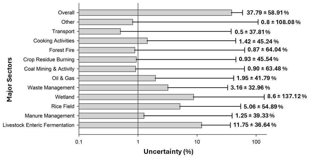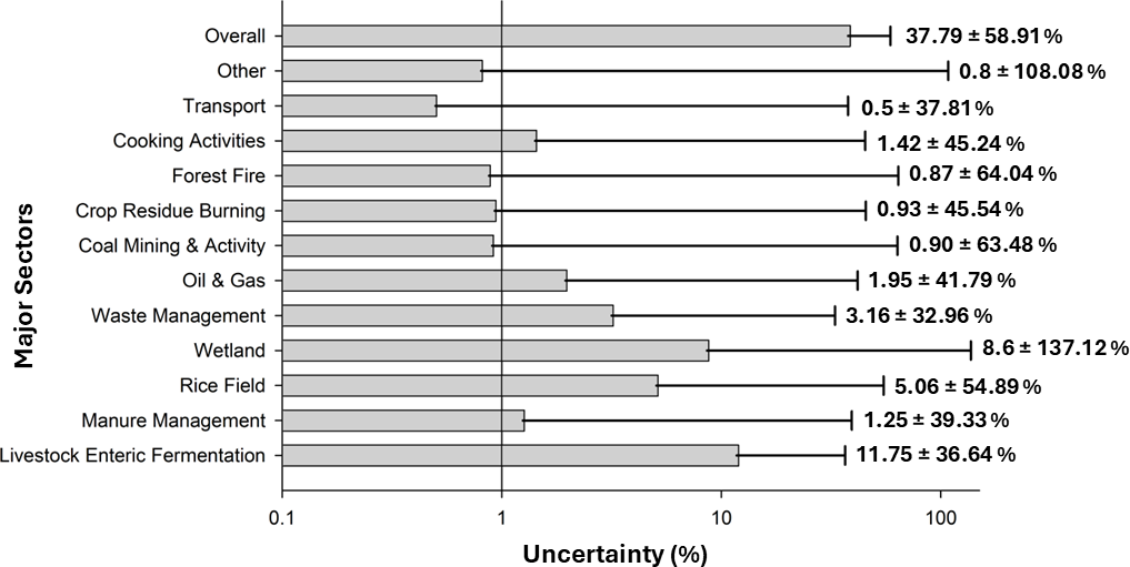 Although the current study on methane emissions in India is extensive, it acknowledges inherent limitations in its estimations. The reliance on secondary activity data and emission factors and the lack of sufficient details introduces a degree of uncertainty. Despite these limitations, the study addresses crucial aspects of filling the data gap and providing support to climate modeling and will be instrumental in identifying methane hotspots across the country. It will also enhance the quantification of the roles played by various natural and anthropogenic sources in the country, thereby assisting policymakers in implementing advanced technological mitigation strategies to reduce methane emissions. The uncertainty of all the individual sectors lies in the range of ±32 %–161 % where the natural sources like wetlands and termites have higher uncertainty levels of ±137 % and ±161 % respectively. The uncertainty estimated from waste management is restricted to ±33 %. The overall uncertainty of the current CH4 emission inventory is found to be ±59 %. The sector-specific uncertainty level is illustrated in Fig. 5. The comparatively higher uncertainty associated with certain source categories, particularly wetlands and termites, primarily reflects deficiencies in high-resolution activity data and the limited availability of region-specific and country-wise emission factors. These natural sources are inherently difficult to constrain due to strong spatial and seasonal variability and their dependence on environmental drivers. Although sectoral uncertainties may affect the magnitude of emissions at localized scales, they do not compromise the integrity of the broader spatial patterns. Most of the previous studies haven't reported the sector-wise uncertainties for India specifically and global studies like Saunois et al. (2025) have reported the uncertainty of ∼ 45 % for Southeast Asia as a whole. This is the mean uncertainty calculated for all other nations in Southeast Asia, including India, where the uncertainty associated with large country like India is unclear. Solazzo et al. (2021) presented the sectoral uncertainties of CH4 in the EDGAR estimation for India. The reported uncertainties in the Energy: fuel consumption sector were found to be 223 %, followed by Oil & Gas (139 %), Waste (107 %), Solid fuels (57 %), Industrial processes and product use (42 %), and Agriculture (42 %). However, the uncertainty reported here is improved with the use of regional activity data, diverse proxy data and regional scale sectoral emission factors. The uncertainty shoots up with the inclusion of natural sources like emissions from Wetlands (Inland wetland, Coastal wetland & Mangroves) and Termites. It is observed that uncertainty associate with small sectors like coal mining, forest fire is high as compared to major traditional sectors like Livestock and paddy field. Besides these sectors, the overall anthropogenic emission uncertainty is found to be ∼ 44 %, improving the reliability of developed present inventory and robustness of the emission dataset. The higher uncertainty for various sources, including natural sources, is due to the paucity of updated technological emission factors. With higher emissions and higher uncertainty of the wetland sector, it alone drives the uncertainty upward.
