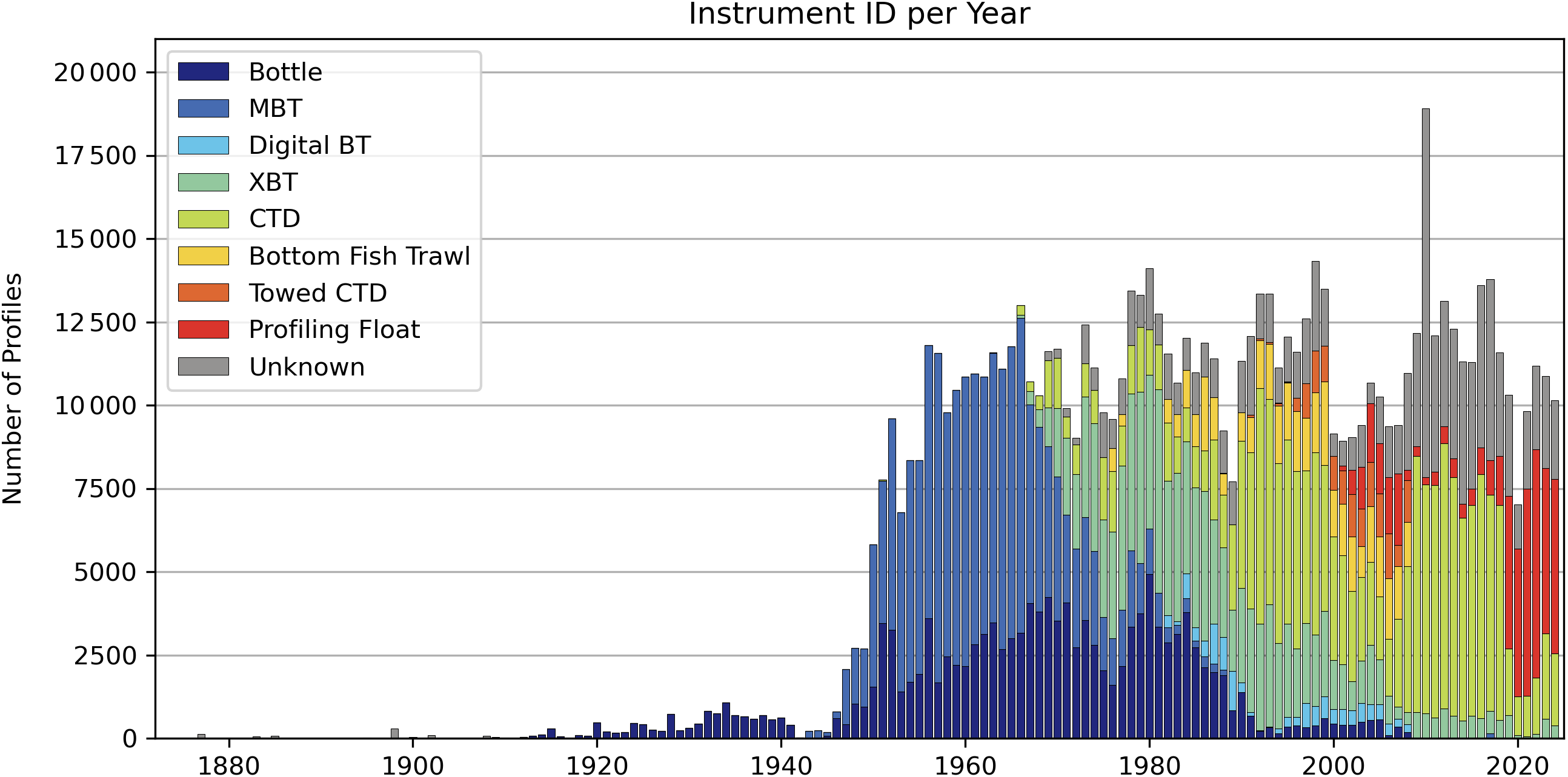 Unlike casts obtained from other sources, the temperature and salinity cast files from NAFC had not all been quality controlled. Therefore, additional steps were required before the casts could be combined with all other sources. First, casts that contained abnormalities were flagged and not considered for further analysis. These include casts with missing or non-sensical latitudes (outside []° N range), longitudes (outside []° W range), and time records (impossible recordings or time in the future, for example). Casts would also be ignored if there was no pressure record or if the temperature and salinity variables were empty. If no irregularities were found, temperature and salinity measurements would be bin-averaged according to pressure from surface to 5000 dbar using 1 dbar vertical resolution and converted from .pfile into yearly NetCDF files. Note that for some files, only the depth (in m) was available, so we used the latter as an approximation for the pressure. Latitude, longitude, cast identification, comments, instrument type, instrument identification, sounder depth, and time were also recorded. During the 1960s and 1970s, negative temperature measurements taken from MBTs were incorrectly recorded as either 0 values or switched to positive (−1.5 °C becomes 1.5 °C for example). These casts were manually removed from the data product after an exhaustive visual inspection of the meta data (this problem only affected data that originated from one source).