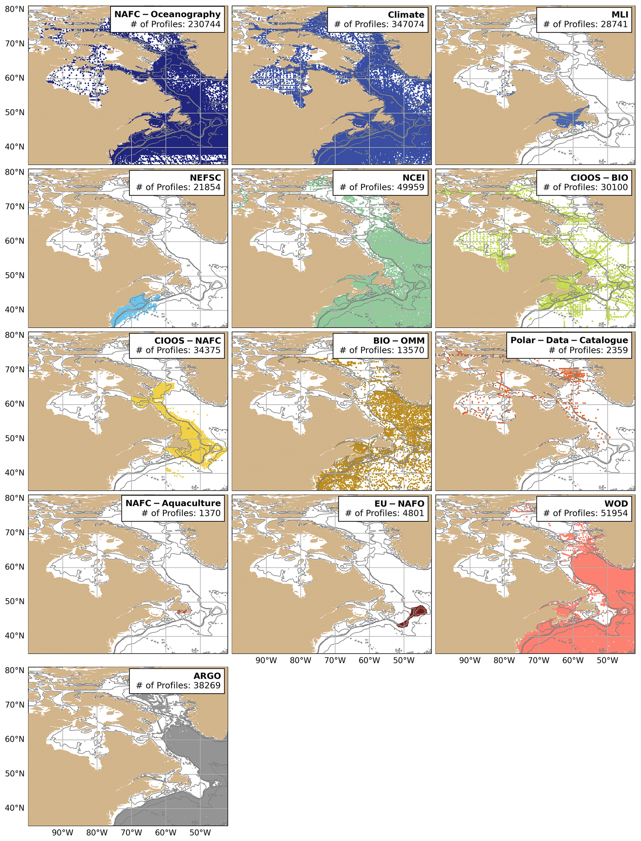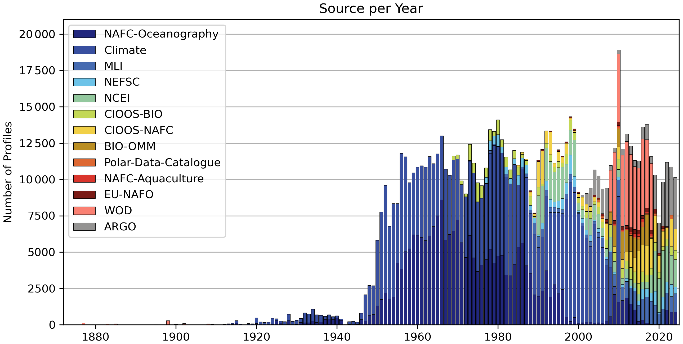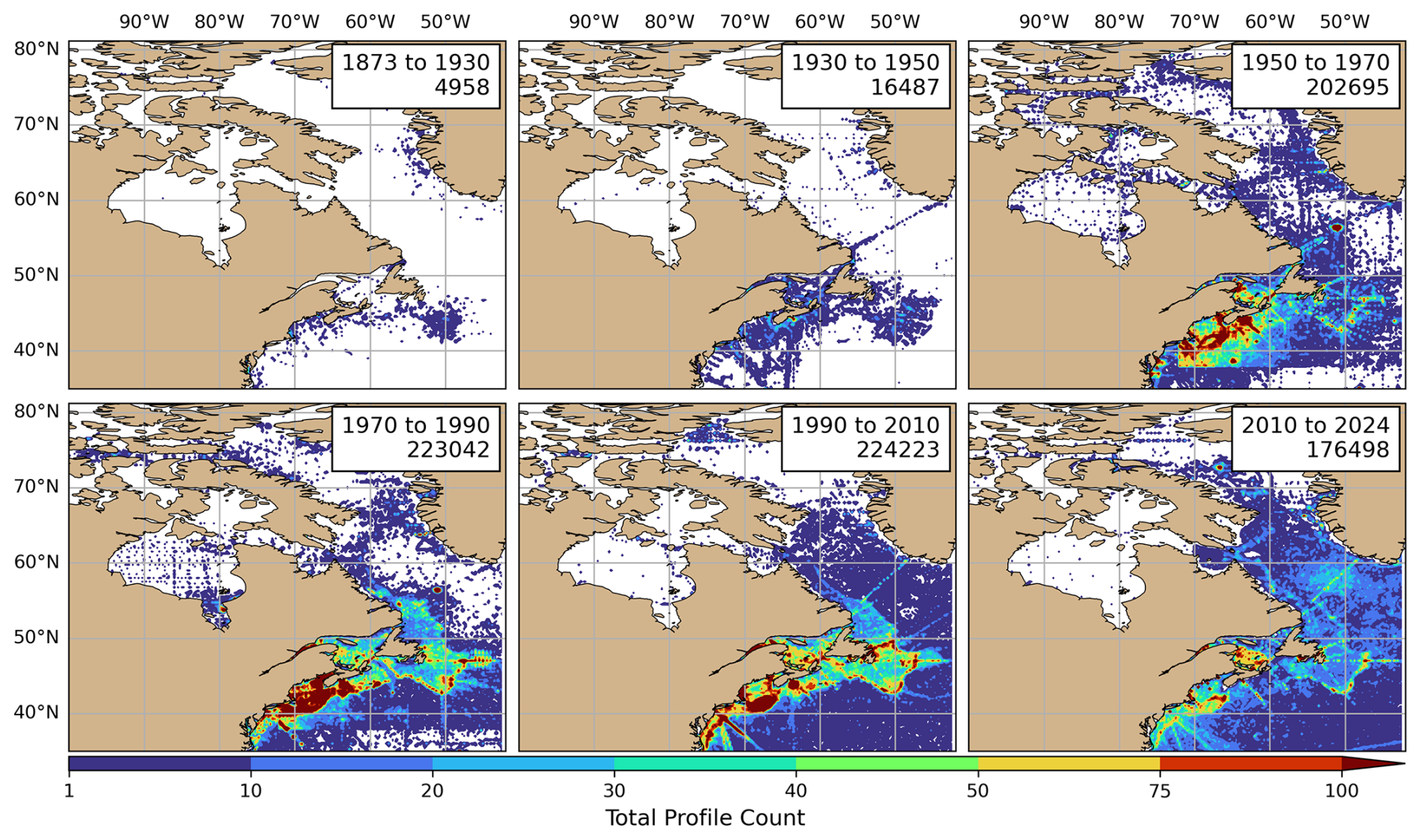 Hydrographic observations (temperature and salinity) have been collected regularly in this region by Canada and other countries since the mid 1800s (Deser et al., 2010). The number of ocean temperature and salinity measurements taken in the NW Atlantic is unusually high compared to other regions, due to the presence of historical trade routes between Europe and North America (Deser et al., 2010). More recently, yearly oceanographic surveys, such as those from the Atlantic Zone Monitoring Program (AZMP; Therriault et al., 1998) (1998–present), have ensured consistent oceanographic coverage over the Canadian Atlantic Shelf and slope (e.g., Galbraith et al., 2025). One of the first attempts to make a comprehensive version of these historical data publicly available was made by Gregory (2004). The database referred to as Climate has been a great asset for years, but was not updated or maintained beginning about 2009 due to the lack of dedicated funding. Since 2019, the Canadian Integrated Ocean Observing System (CIOOS), Canada’s nucleus for integrated ocean science and observing activities, is working to create an open-access national platform that facilitates data discovery for end-users. Some of the data presented in this study are already present in CIOOS, and this number is expected to grow in the years to come.