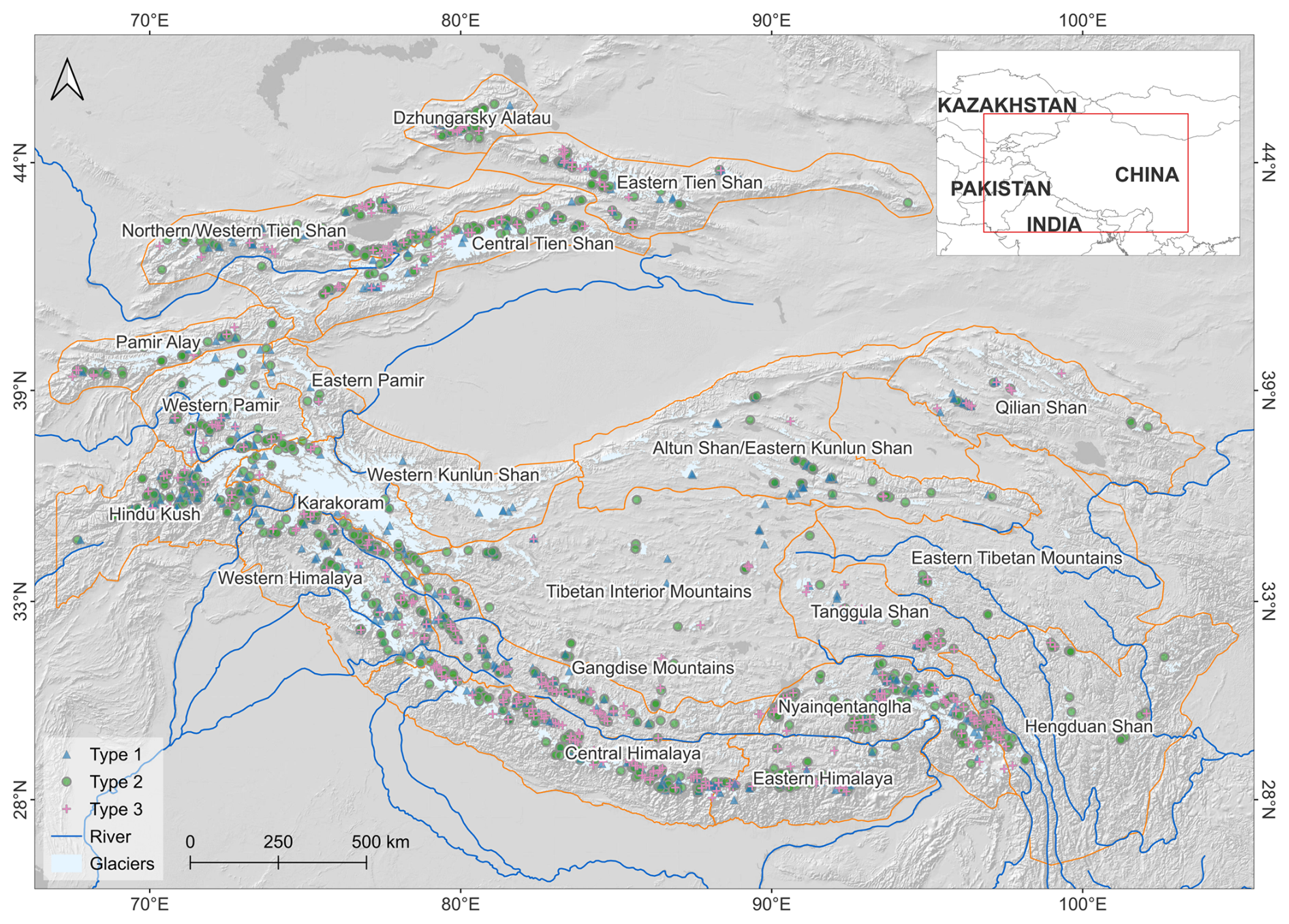 Figure 1Location of HMA and distribution of LTGs. Glacier outlines from the Randolph Glacier Inventory (RGI v7.0). Types of LTGs are shown in Table 1. Basemap is Powered by Esri.