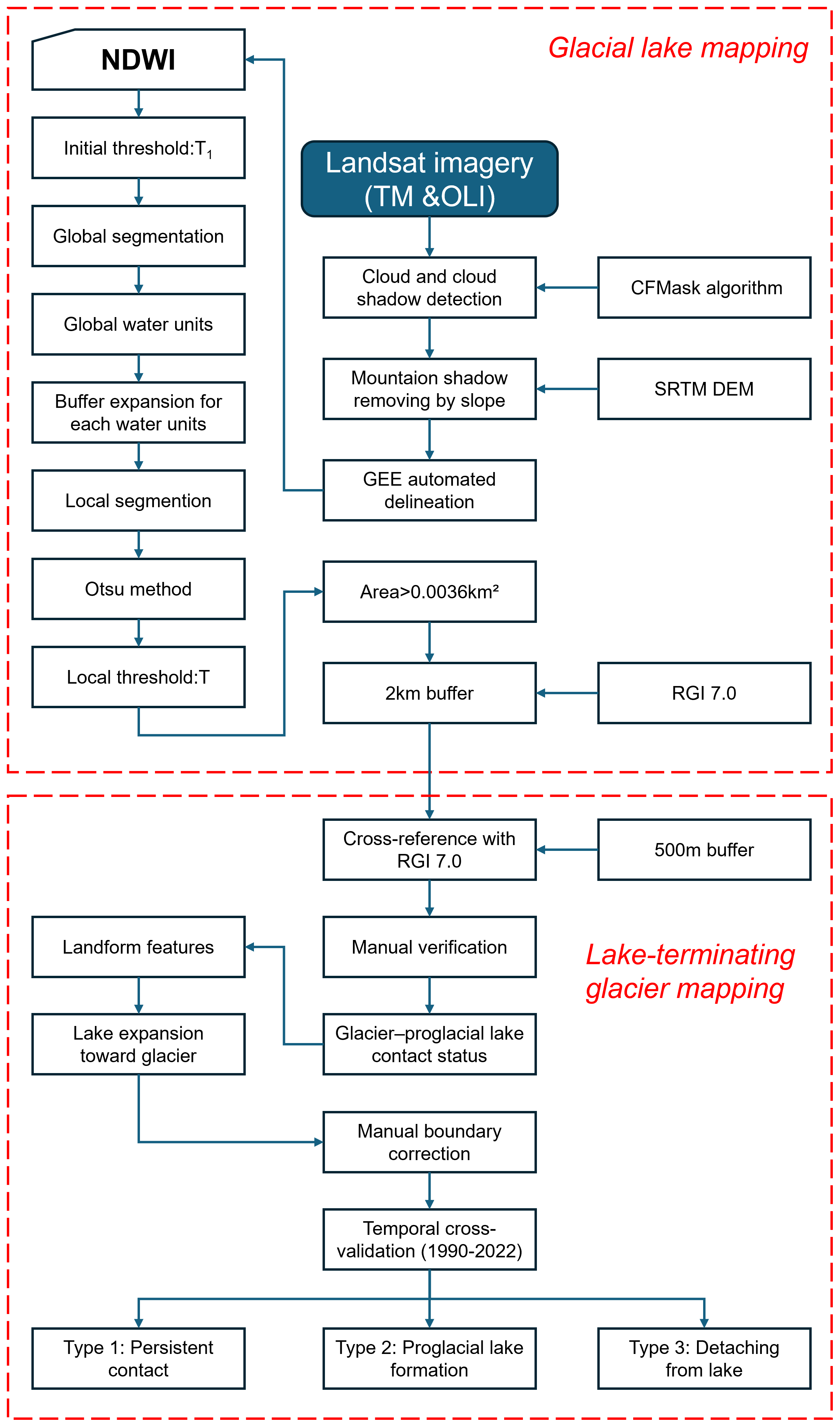 Using Landsat imagery, we applied a semi-automated mapping approach in Google Earth Engine (GEE) to inventory proglacial lakes across High Mountain Asia (HMA) in the 1990s and 2020s, and compiled the first region-wide dataset of LTGs and their proglacial lakes. In 2022, HMA contained 1740 LTGs (5082.08 ± 13.15 km2), of which 667 glaciers (3454.59 ± 12.43 km2) maintained lake contact since 1990, and 1073 glaciers (1,627.49 ± 4.30 km2) developed new proglacial lakes. These glaciers were mainly distributed between 2735 and 8016 m a.s.l. Additionally, 468 glaciers (960.13 ± 3.18 km2) lost lake contact during the period.