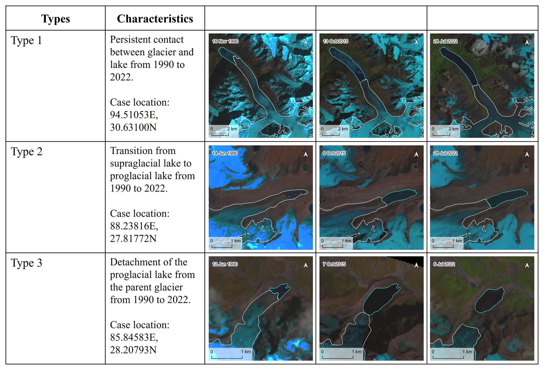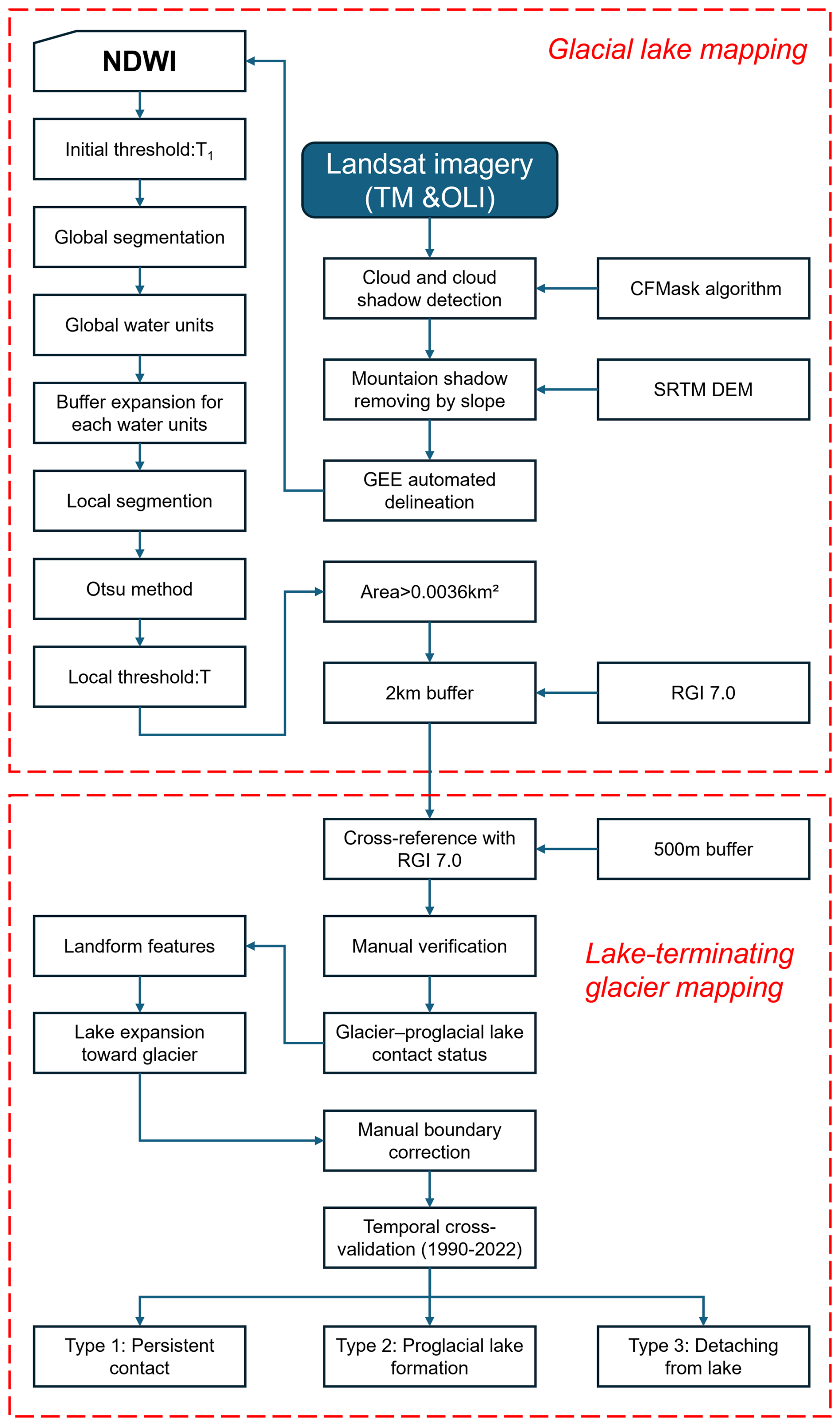 In this study, LTGs are defined as glaciers that develop proglacial lakes along the direction of ice flow and are in direct contact with these lakes. The proglacial lake dataset was cross-referenced with the RGI 7.0 glacier inventory to identify LTGs. Results were refined through detailed visual inspection and manual correction using multi-source data, including Landsat and PlanetScope imagery, online maps (e.g., Google Earth, Esri basemap), and existing glacial lake datasets (Wang et al., 2020; Chen et al., 2021; Zhang et al., 2023). The identification of glacier-lake contact followed a two-step procedure. (1) Preliminary screening: A 500 m buffer was applied to assess spatial intersections between glacier boundaries and proglacial lakes, identifying potentially connected glacier-lake pairs. (2) Manual verification: Different criteria were applied for different periods. For the year 2022, multi-source moderate-to-high resolution imagery (e.g., PlanetScope, Landsat, Google Earth, Esri basemaps) was used. Glacier-lake contact was confirmed when proglacial lakes overlapped with the glacier terminus and exhibited diagnostic geomorphic features, such as terminal ice cliffs or transverse crevasses perpendicular to the flow direction. Due to limited data availability and the relatively coarse spatial resolution of Landsat imagery (30 m) in 1990, direct identification of LTGs for that year involved considerable uncertainty, particularly for small glaciers, where boundary errors increase with decreasing glacier area. To address this, a temporal cross-validation approach was employed. Glaciers with ambiguous contact in 1990 were classified as interacting if satellite imagery from 1990 to 2022 showed lake expansion toward the glacier terminus. Based on the temporal evolution of glacier-lake contact, LTGs were categorized into three types (Fig. 4): (1) terminus persistent contacting with proglacial lake (Type 1); (2) terminus experiencing transition from supraglacial lake to proglacial lake (Type 2); and (3) terminus detaching from proglacial lake (Type 3).