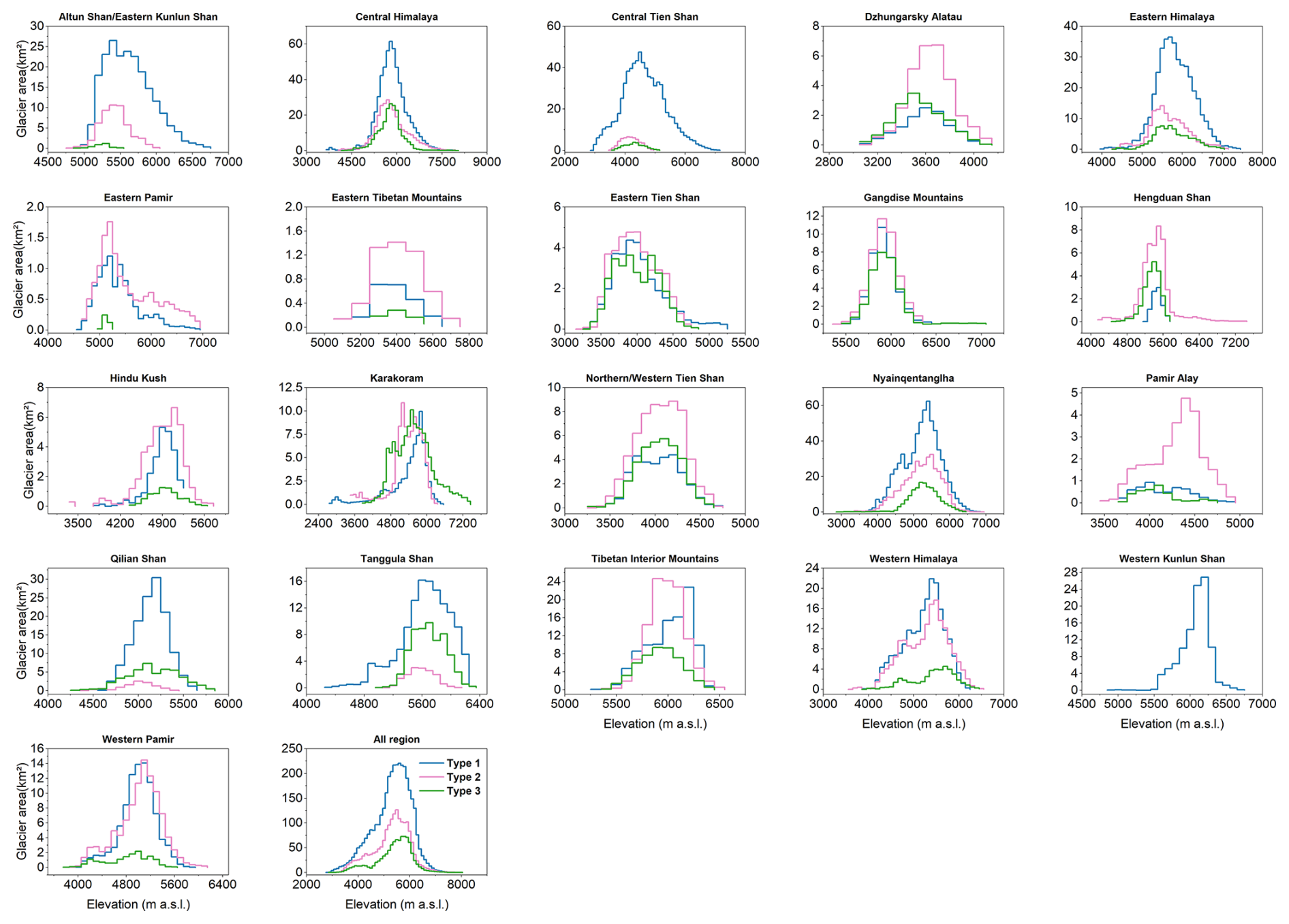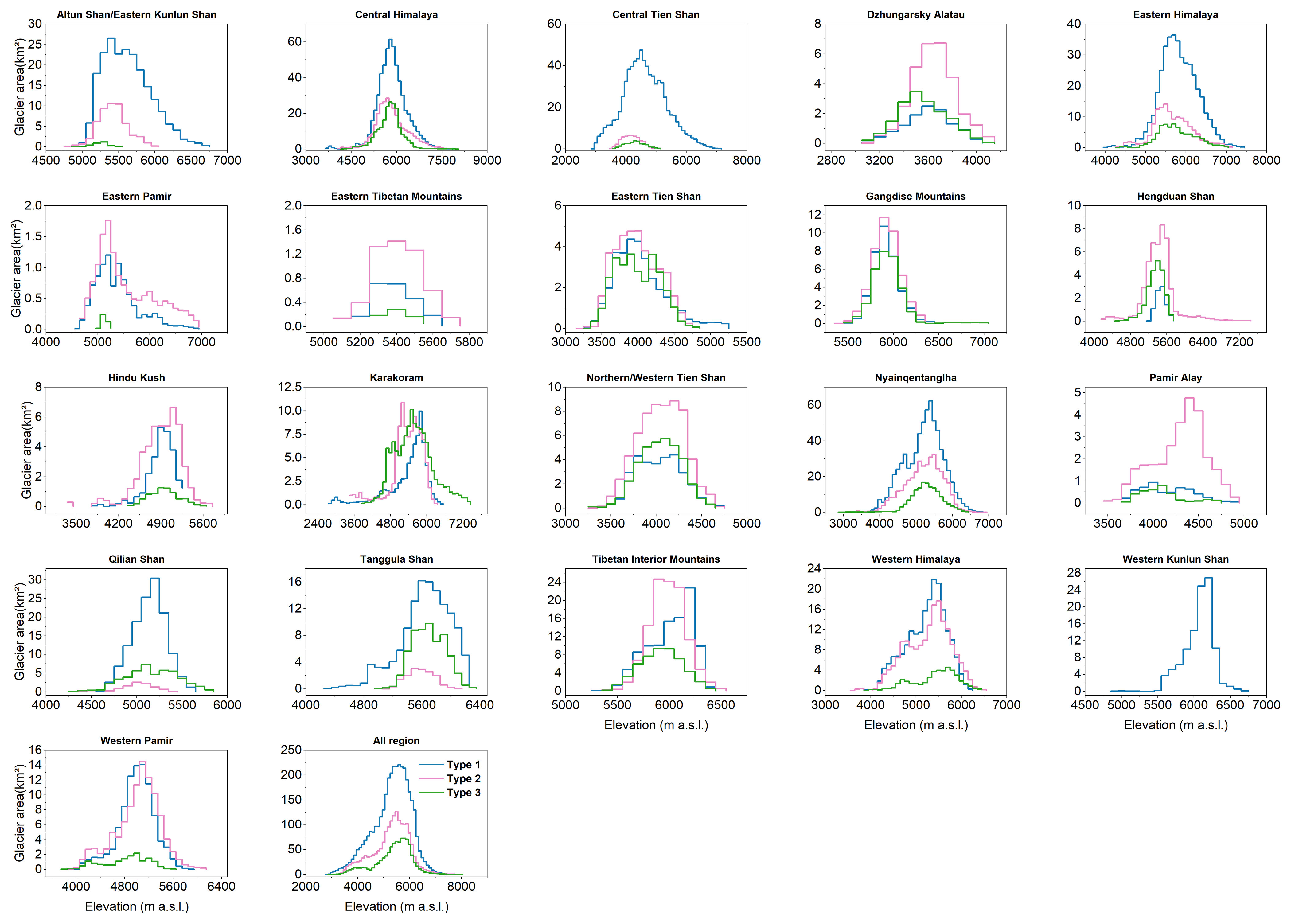 Figure 6Area-Elevation distribution of LTGs across subregions, showing glacier area within 100 m elevation bins.