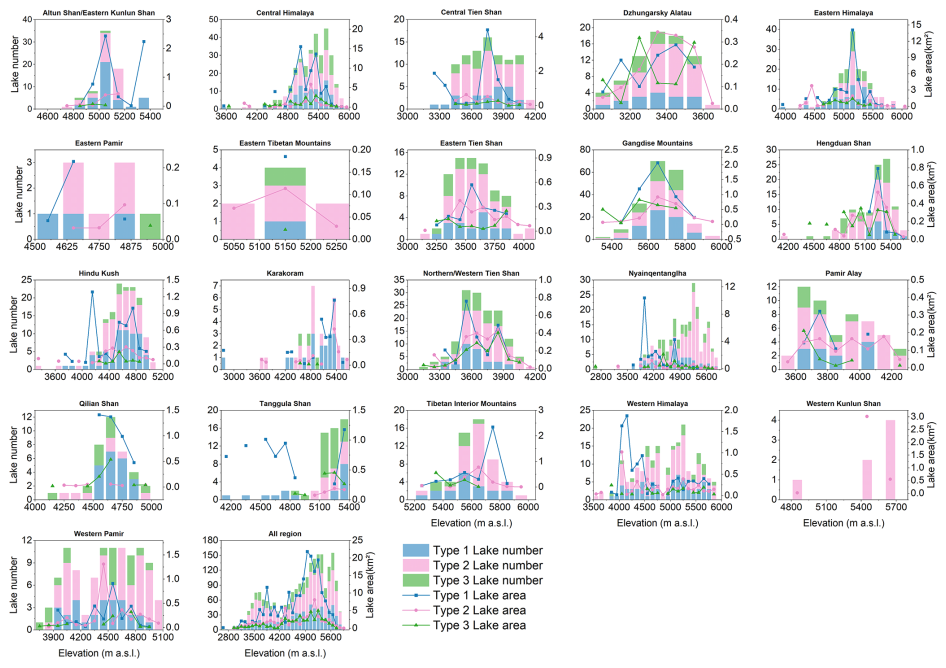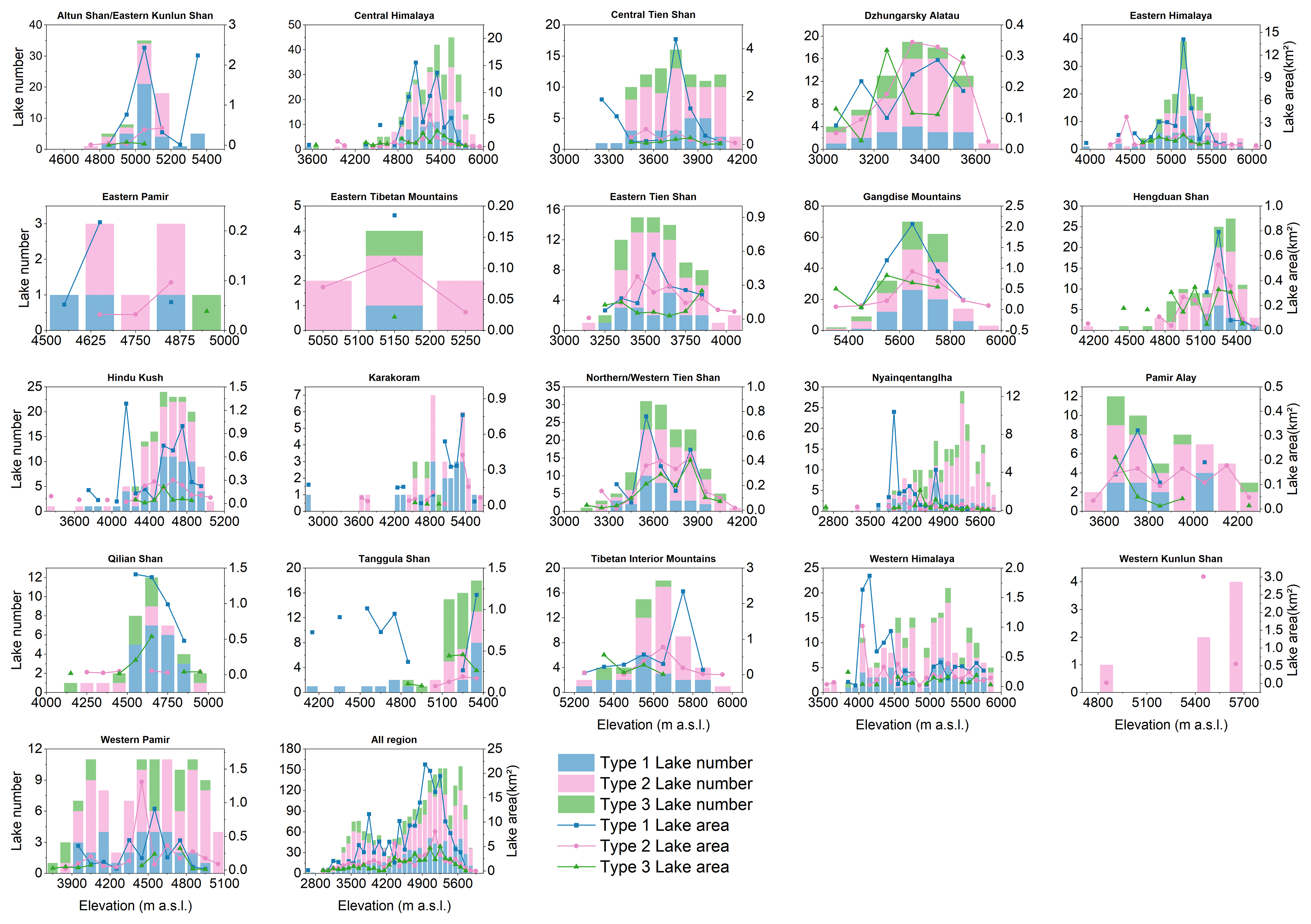 Significant variations exist in the number and area distributions among glacier types in HMA. From 1990 to 2022, Type 2 glaciers, those forming new proglacial lakes, were the most numerous (1073, Table S1), dominating in all regions except Altun Shan/Eastern Kunlun Shan, Qilian Shan, and Tanggula Shan. Conversely, Type 1 glaciers have the largest total area (3454.59 ± 12.43 km2), concentrated primarily in the Himalayas, Nyainqentanglha, Central Tien Shan, Qilian Shan, Tanggula Shan, and Western Kunlun Shan (Table S1). The Central Himalaya hosts the most glaciers across all types: 94 Type 1 (552.77 ± 2.71 km2), 138 Type 2 (244.80 ± 1.56 km2), and 84 Type 3 (202.67 ± 1.11 km2). All glacier types show consistent area peaks between 5000 and 6000 m, with similar patterns across subregions (Fig. 6). In 2022, Type 2 proglacial lakes were the most numerous in HMA (1123, Table S3), dominating in number across all regions except Altun Shan/Eastern Kunlun Shan, Qilian Shan, Karakoram, and Western Kunlun Shan. Conversely, Type 1 lakes had the largest total area (207.18 ± 0.82 km2) and accounted for the largest share of total area in all regions except the Western Pamir, Hengduan Shan, Dzhungarsky Alatau, and Eastern Tibetan Mountains. The Central Himalaya hosted the greatest abundance of all three lake types, with 91 Type 1 (76.89 ± 0.51 km2), 149 Type 2, and 80 Type 3 (15.70 ± 0.21 km2) lakes. The Eastern Himalaya had the largest Type 2 lake area (10.73 ± 0.03 km2, Table S3). In HMA, the elevation distribution of proglacial lake types is generally consistent, with peak numbers between 5000 and 5700 m and peak areas between 4700 and 5400 m (Fig. 7). However, regional variations are observed in the elevation distribution of lake numbers for different lake types. Specifically, in the Nyainqentanglha region, Type 2 proglacial lakes exhibit a higher peak number range, between 5200 and 5400 m. Regarding area-elevation patterns, certain subregions display lower peak elevations, encompassing Type 2 lakes in the Eastern Himalaya and Northern Tibetan Mountains, and Type 1 lakes in the Eastern Pamirs, Hindu Kush, Nyainqentanglha, and Tanggula Shan (Fig. 6).