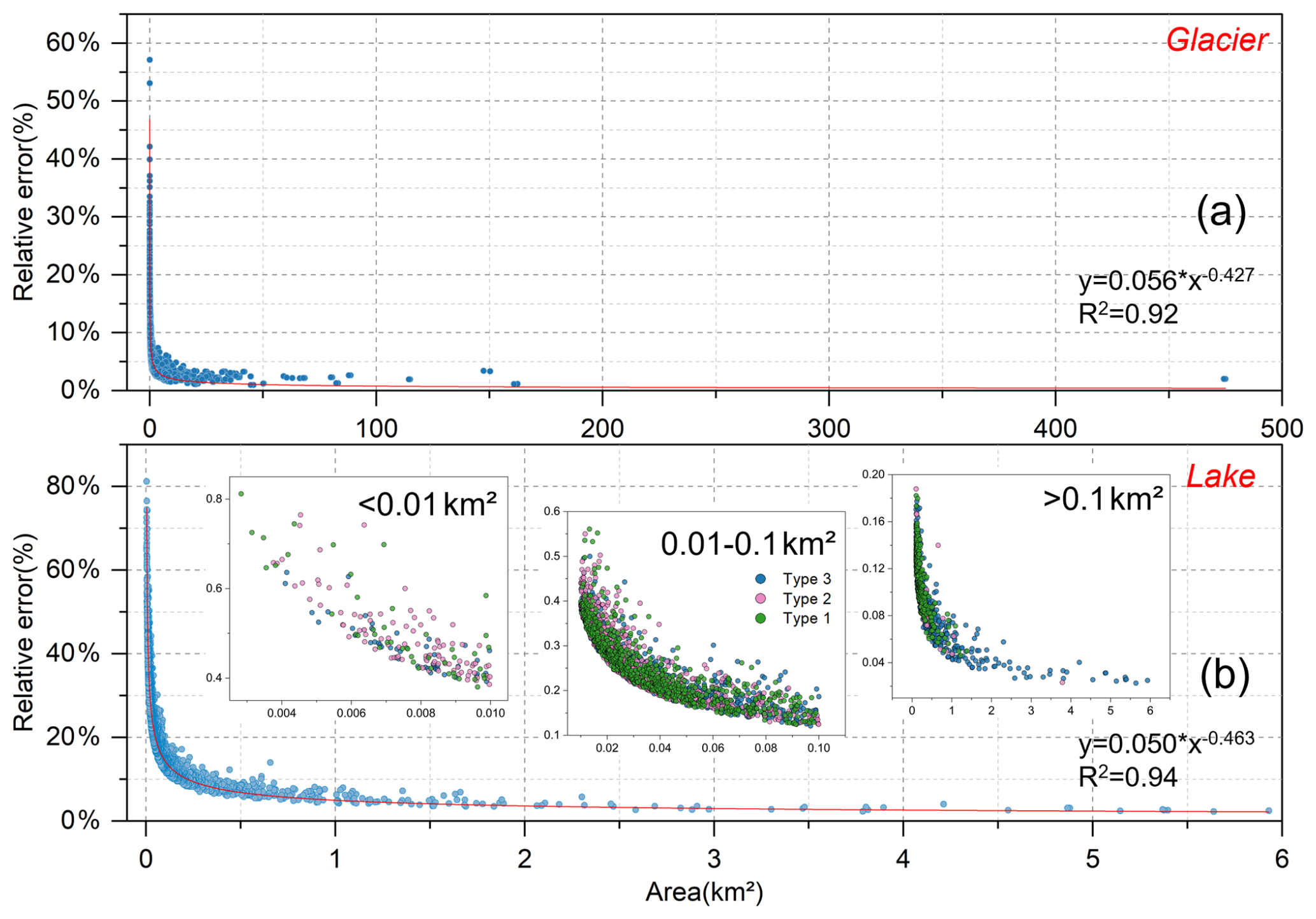 The uncertainty estimates indicate that as the glacier or lake area increases, the relative error of individual features decreases. In the study area, the total absolute area errors for glaciers in 1990 and 2022 were ±13.65 km2 and ±13.53 km2, respectively, with average relative errors of ±7.24 % and ±8.12 %. The relative error of glacier area shows a significant power-law relationship with the glacier size (, R2=0.92, Fig. 8a). Additionally, the total absolute area error for proglacial lakes in 1990 and 2022 were ±0.69 km2 and ±0.96 km2, respectively, with average relative errors of ±21.99 % and ±23.69 %, following a similar significant power-law relationship (, R2=0.94, Fig. 8b). We found that the maximum relative error for proglacial lakes exceeds 80 %. We therefore stratified relative error statistics by lake area bins and glacier types. The largest errors are primarily associated with lakes smaller than 0.01 km2, which have a mean relative error of 49 %. Within this size class, Type 2 proglacial lakes are most prevalent, accounting for 52 % of all lakes < 0.01 km2. To better constrain the impact of these small lakes on overall dataset accuracy, we visually verified them using higher resolution remote sensing imagery (PlanetScope, Esri basemaps, and Google imagery), thereby reducing misidentification arising from limited spatial resolution.