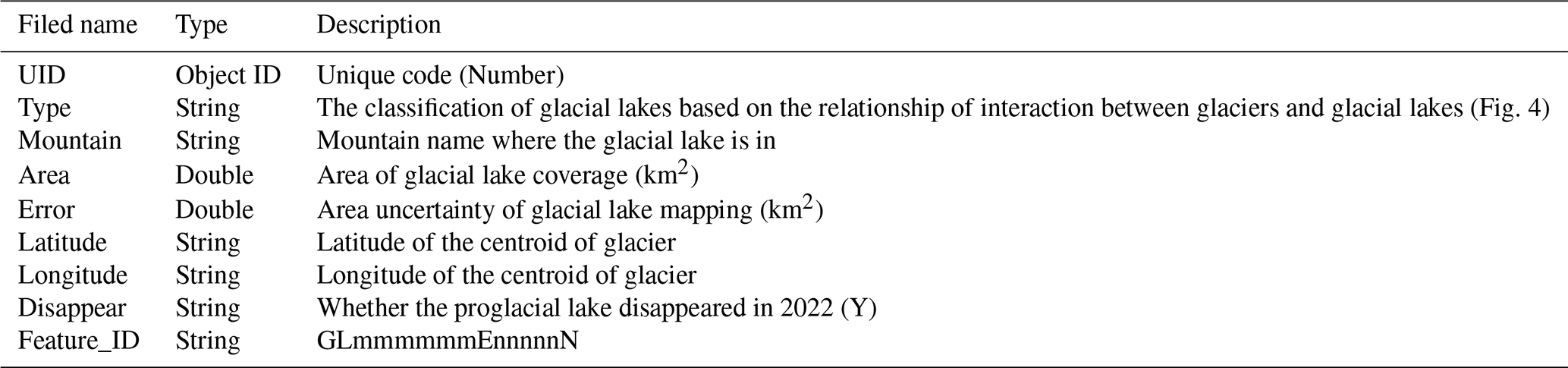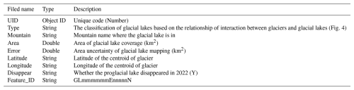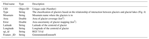 In this inventory, 9 attribute fields (Table 1) were recorded for the LTG, including a unique identifier, type, associated mountain range, area, mapping uncertainty, location (longitude and latitude), RGI7 ID, and feature code. Similarly, the proglacial lake inventory contains 9 attribute fields (Table 2), including a unique identifier, associated mountain range, type, mapping uncertainty, location (longitude and latitude), feature code, and a flag indicating whether the lake has disappeared. Both LTG and proglacial lake datasets include data for two time periods: 1990 and 2022, with identical attributes for both periods. The unique identifier is an automatically generated sequential integer, while the feature code follows the formats GmmmmmmEnnnnnN (Feature_ID) for glaciers and GLmmmmmmEnnnnnN (Featrue_ID) for lakes, where G denotes glacier, GL denotes glacial lake, m and n represent the longitude and latitude multiplied by 1000, respectively, and E and N indicate east longitude and north latitude. Identical LTGs and proglacial lakes share the same feature code (Feature_ID) to facilitate data linkage. Area and perimeter are calculated automatically from the feature geometry. The type of classification follows the criteria described in Sect. 3.2. Each feature's associated mountain range is determined by overlaying with mountain range boundaries, and mapping uncertainty is estimated according to Sect. 3.3.