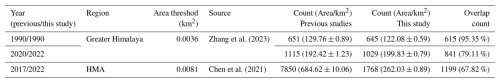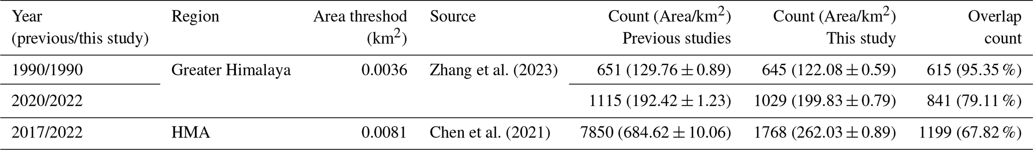 Publicly available data on LTGs and their proglacial lakes in HMA remain scarce, with recent datasets primarily focusing on glacial lakes. Consequently, this study selected two glacial lake datasets that partially overlap in time with our research and include proglacial lakes for comparison (Table 3). The results indicate that, within the same study area, our data closely align with those of Zhang et al. (2023). In 1990, the overlap rate of proglacial lakes between the dataset of Zhang et al. (2023) and ours exceeded 90 %, while in 2020/2022, the overlap rate was 79 %. In contrast, significant discrepancies were observed with the dataset of Chen et al. (2021). For the period 2017/2022, the dataset of Chen et al. (2021) identified 7850 proglacial lakes, whereas our study identified only 1768, with an overlap rate of 67.82 %. To further clarify the causes of these discrepancies, we selected a representative subregion in the central Himalaya as a sample area for cross-validation (Fig. S1). Our dataset indicates that 45 proglacial lakes were present in this area in 2022. In contrast, Chen et al. (2021) reported 335 glacial lakes in 2017, of which only 29 (64 % of our proglacial lakes) overlap with our inventory Zhang et al. (2023) reported 38 proglacial lakes in 2020, with 30 (67 %) overlapping with our results. Chen et al. (2021) likely used a more permissive definition when screening lakes in front of glacier termini, effectively including many water bodies that are not in direct contact with glacier. We apply strict criterion (Sect. 3.2) and define proglacial lakes as those that are in contact with glacier ice and situated at the downstream end along the glacier flow direction. Part of the mismatch may also arise from differences in lake-type labeling during transitional stages. Several water bodies that we classify as proglacial lakes were labeled as supraglacial lakes by Chen et al. (2021) and Zhang et al. (2023). In addition, some supraglacial ponds are currently merging and evolving into a single, unified proglacial lake, and we classify lakes with a high degree of transition as proglacial lakes. Differences in the minimum mapping area threshold further amplify the mismatch. Our inventory and Zhang et al. (2023) uses 0.0036 km2, whereas Chen et al. (2021) used 0.0081 km2, which affects the inclusion of small lakes and therefore the total lake count. Finally, we corrected omissions in earlier inventories where applicable, and additional factors, such as image quality, acquisition dates, and vectorization workflows, may also contribute to the observed discrepancies.