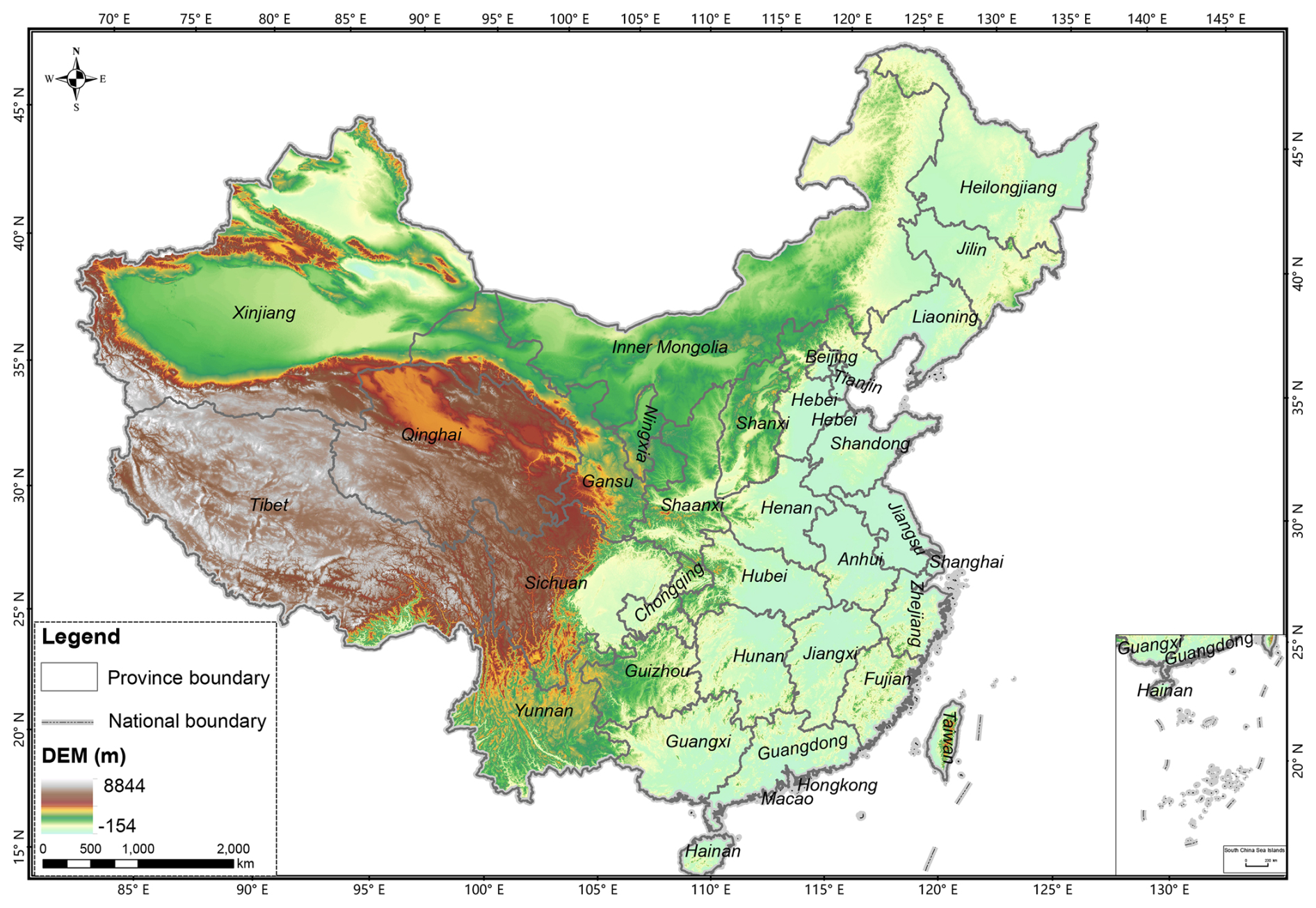 The temporal and spatial patterns of China's ecosystem services are analyzed across 34 provincial administrative regions, including 23 provinces (Hebei, Shanxi, Liaoning, Jilin, Heilongjiang, Jiangsu, Zhejiang, Anhui, Fujian, Jiangxi, Shandong, Henan, Hubei, Hunan, Guangdong, Hainan, Sichuan, Guizhou, Yunnan, Shaanxi, Gansu, Qinghai, Taiwan), five autonomous regions (Inner Mongolia, Guangxi, Tibet, Ningxia, Xinjiang), four municipalities directly under the central government (Beijing, Tianjin, Shanghai, Chongqing), and two special administrative regions (Hong Kong, Macau), as shown in Fig. 1.