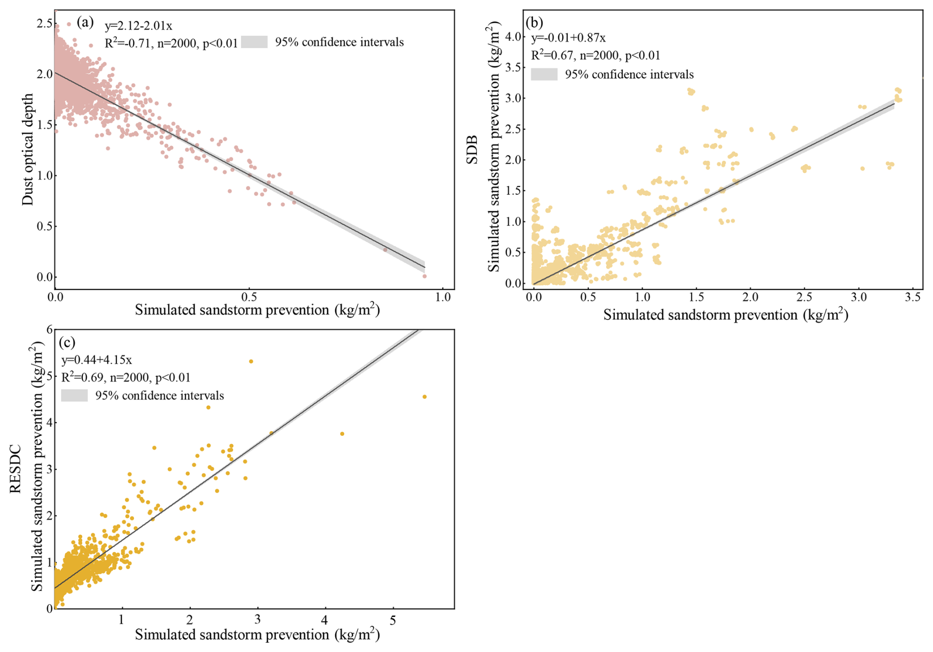 Figure 4Validation of the sandstorm prevention in this study, (a) the simulated sandstorm prevention and dust optical depth of China in 2010, (b) the sandstorm prevention simulated in this study and Science Data Bank (SDB) soil conservation data in 2010, (c) the sandstorm prevention simulated in this study and Resource and Environment Science and Data Center (RESDC) soil conservation data.