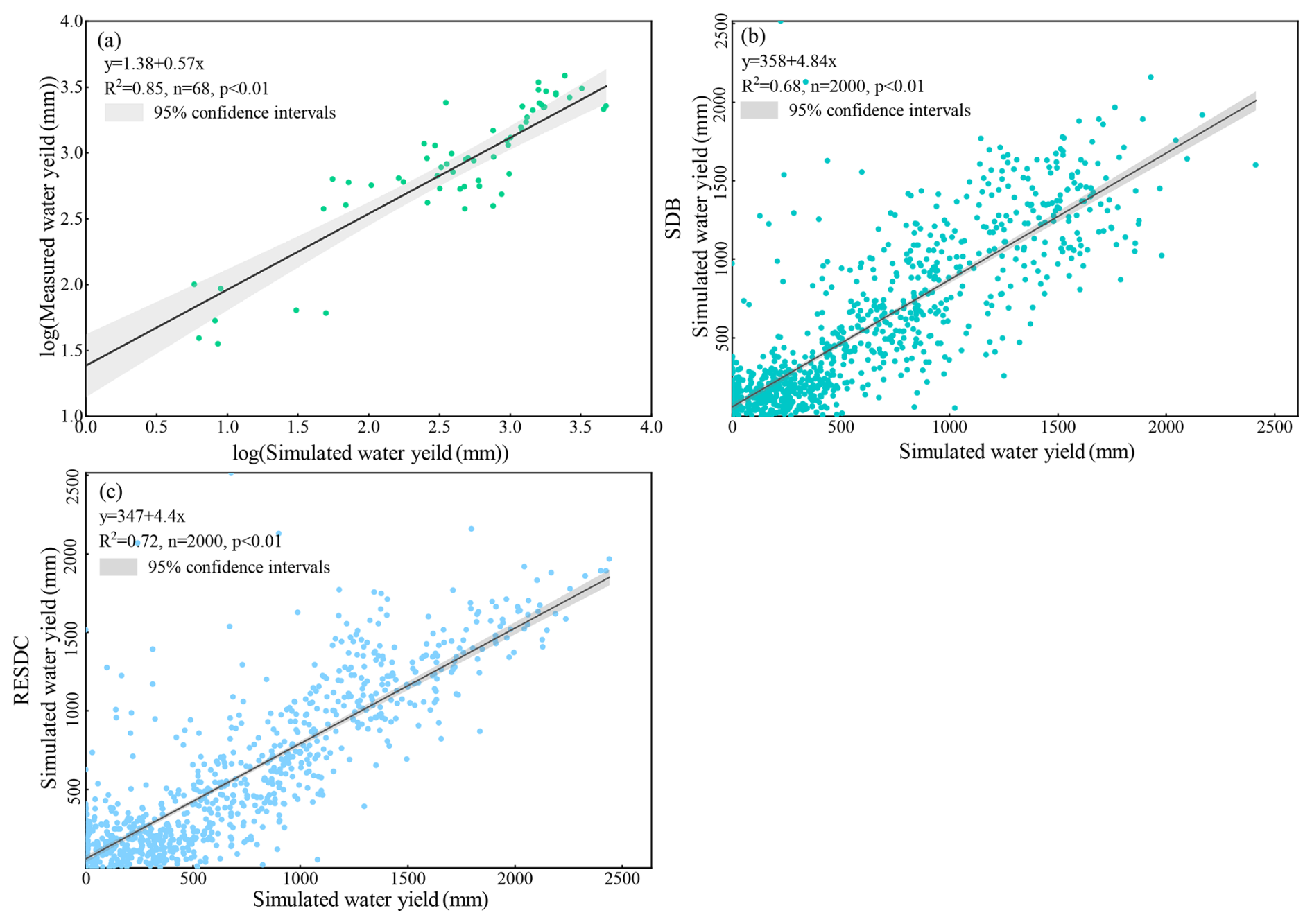 Figure 5Validation of the water yield in this study, (a) the simulations and measurements of water yield for 34 provinces in 2000 and 2020. (b) the water yield simulated in this study and Science Data Bank (SDB) water yield data in 2010, (c) the water yield simulated in this study and Resource and Environment Science and Data Center (RESDC) water yield data.