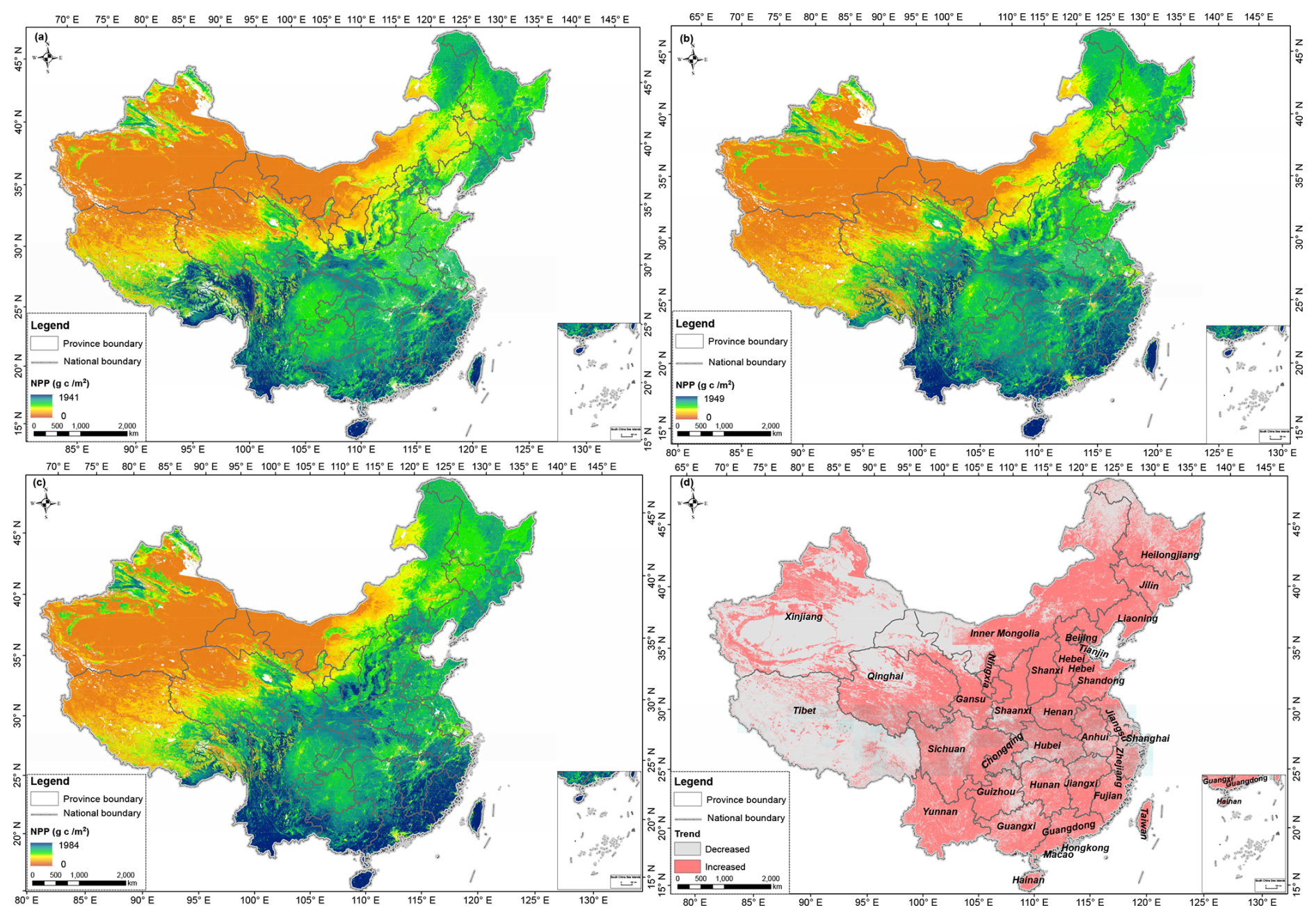 These results are similar to those of Ouyang et al. (2016), who also found significant regional differences in NPP across different areas of China, with an overall increasing trend. This finding is consistent with other studies, such as Feng et al. (2016), which indicated that NPP significantly increased in the Loess Plateau region through vegetation restoration measures. This trend is further corroborated by Zhao and Running (2010), who observed that NPP in China's ecosystems has increased in recent decades, especially in the southeastern regions with relatively high precipitation and temperature.