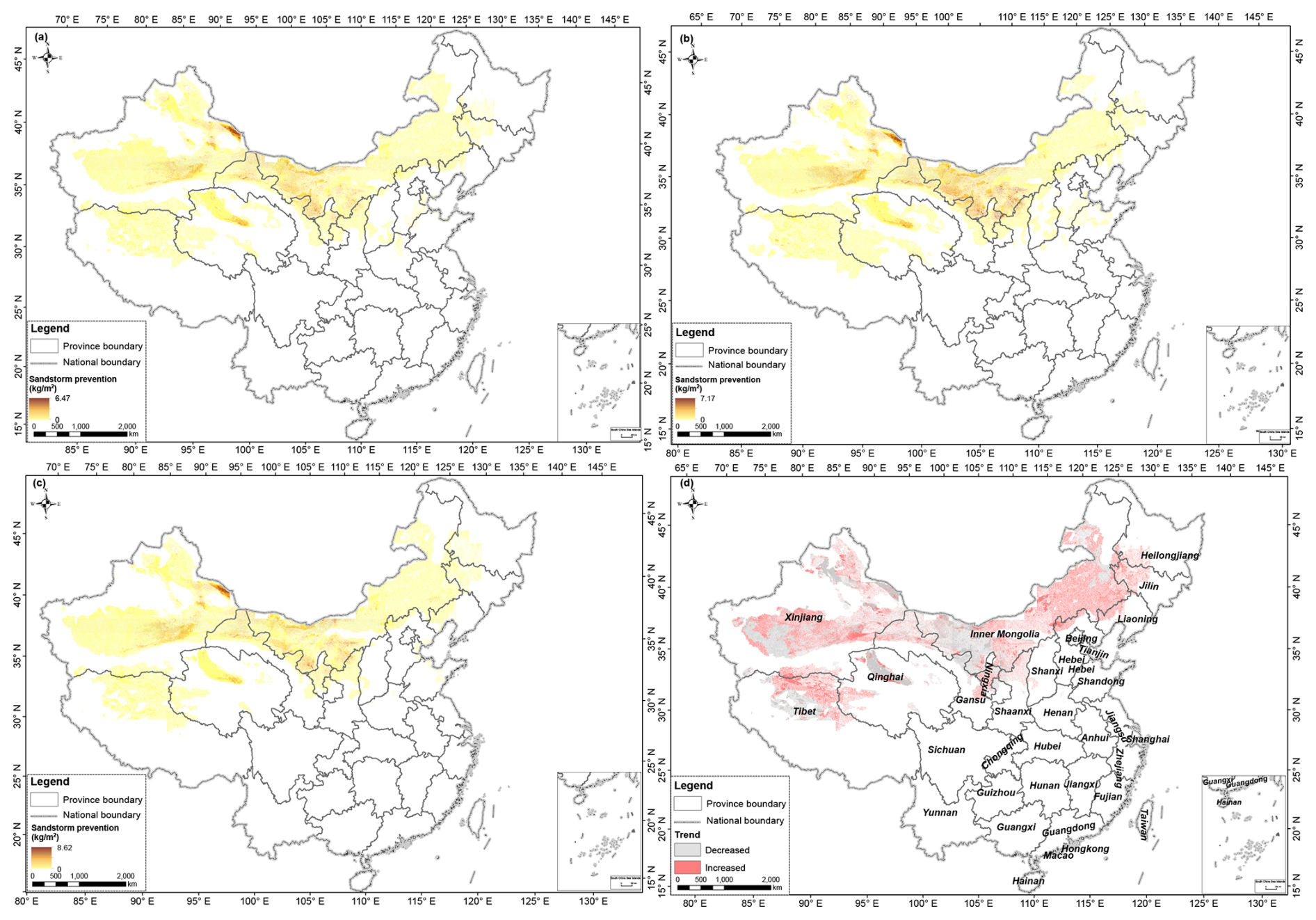 Figure 8Spatial and temporal distribution of sandstorm prevention in China from 2000 to 2020. (a) 2000 sandstorm prevention; (b) 2010 sandstorm prevention; (c) 2020 sandstorm prevention; (d) Sandstorm prevention dynamics from 2000 to 2020.