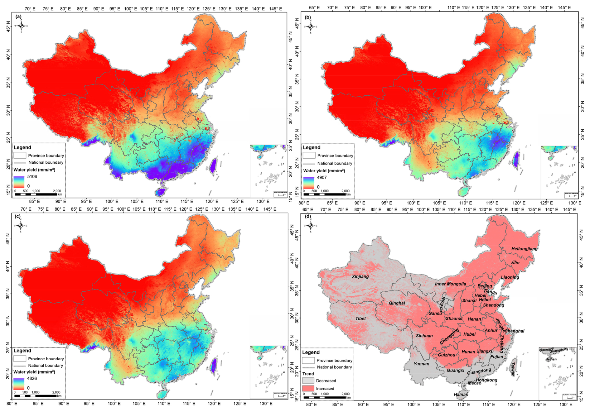 Figure 9Spatial and temporal distribution of water yield in China from 2000 to 2020. (a) 2000 water yield; (b) 2010 water yield; (c) 2020 water yield; (d) Water yield dynamics from 2000 to 2020.