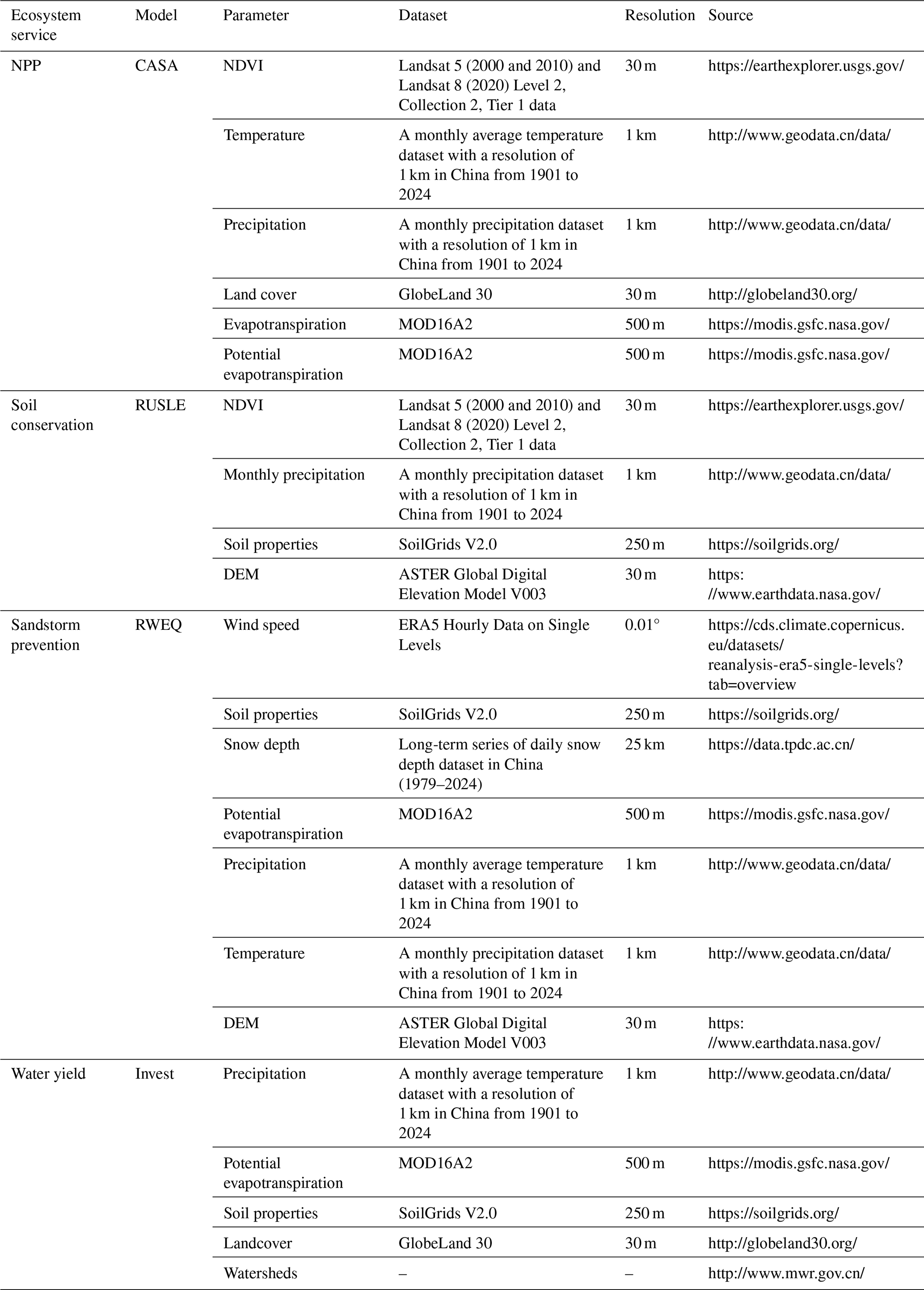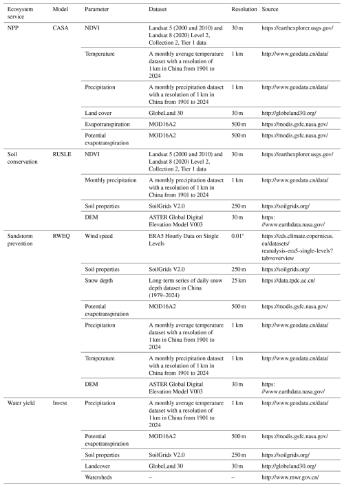 The models and input data were based on the following principles: (1) Widely used of the models: The selected models (e.g., CASA, RUSLE) are well-established within the field of ecosystem service assessment. Their principles are mature and have been extensively validated in applications at global and regional scales, which facilitates the comparison of our results with existing studies. (2) Data availability and model compatibility: The selected models are compatible with the multi-source remote sensing, meteorological, soil, and topographic data collected for this study, ensuring the feasibility of the assessment. (3) Suitability for spatially explicit assessment: All models are capable of spatially explicit calculation, which allows them to fully utilize the 30 m high-resolution spatial data to generate detailed distribution maps, meeting the accuracy requirements for refined management and policy formulation. The application of these models at this fine resolution is well-supported by previous studies. The CASA model has been successfully applied to estimate China's land net primary productivity (NPP) data with high accuracy (Sun et al., 2021; Zhang et al., 2023). Similarly, both the RUSLE and RWEQ models have been successfully applied at high resolution for soil erosion and sandstorm prevention mapping, respectively, demonstrating their suitability for high-resolution assessment (Zong et al., 2025; Yan et al., 2025). The InVEST has proved to be suitable for large-scale water yield assessment in China (Yin et al., 2020). This capability meets the accuracy requirements for refined management and policy formulation.
