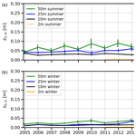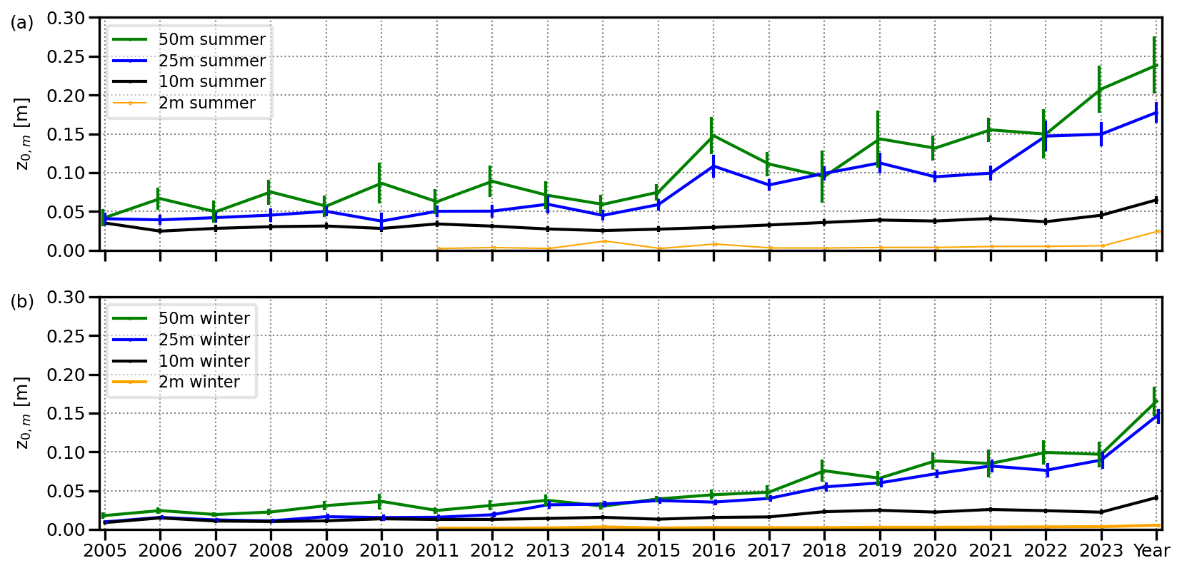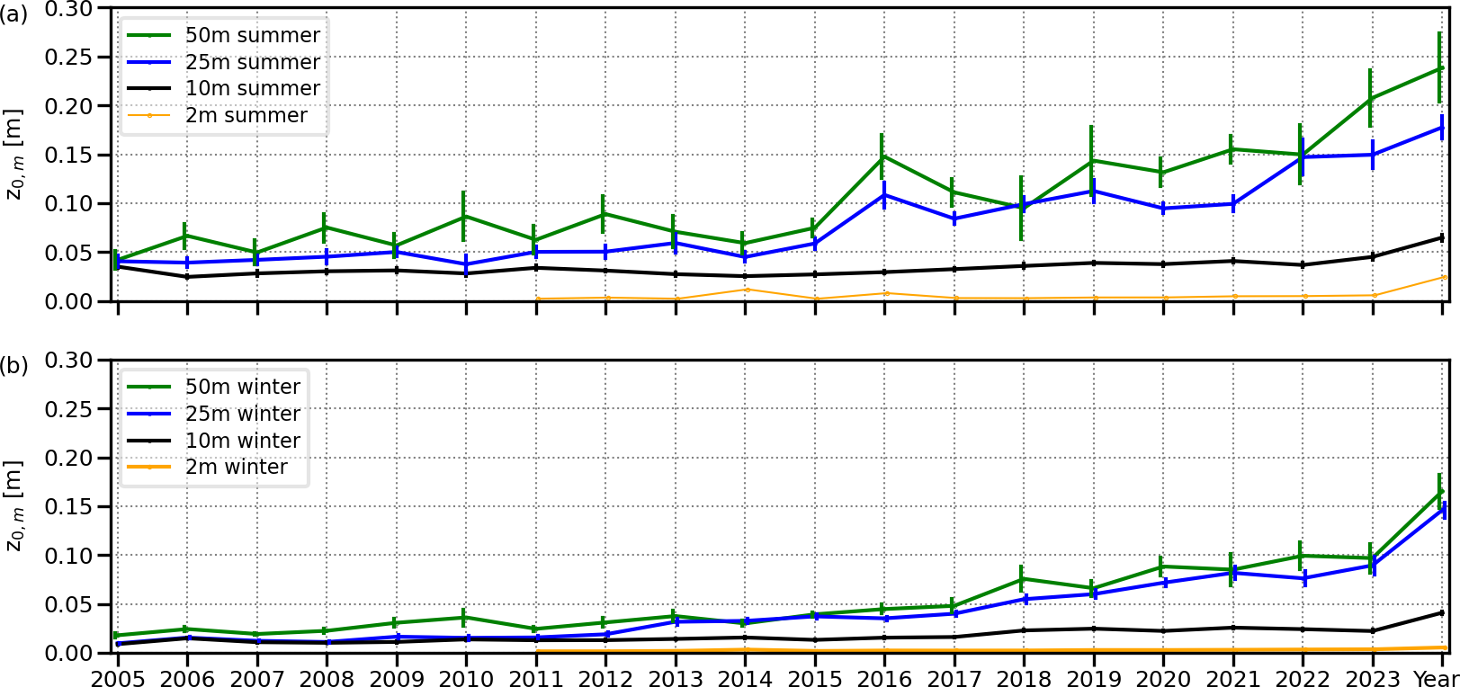 Figure 4Evolution of the yearly median roughness lengths for momentum (z0,m) as derived in neutral conditions from the four mast heights at Cardington. Only wind directions between 155 and 280° are included. Error bars show the 95 % confidence intervals. Data has been divided into the (a) summer and (b) winter months. Note the 2 m data only commenced in 2011.