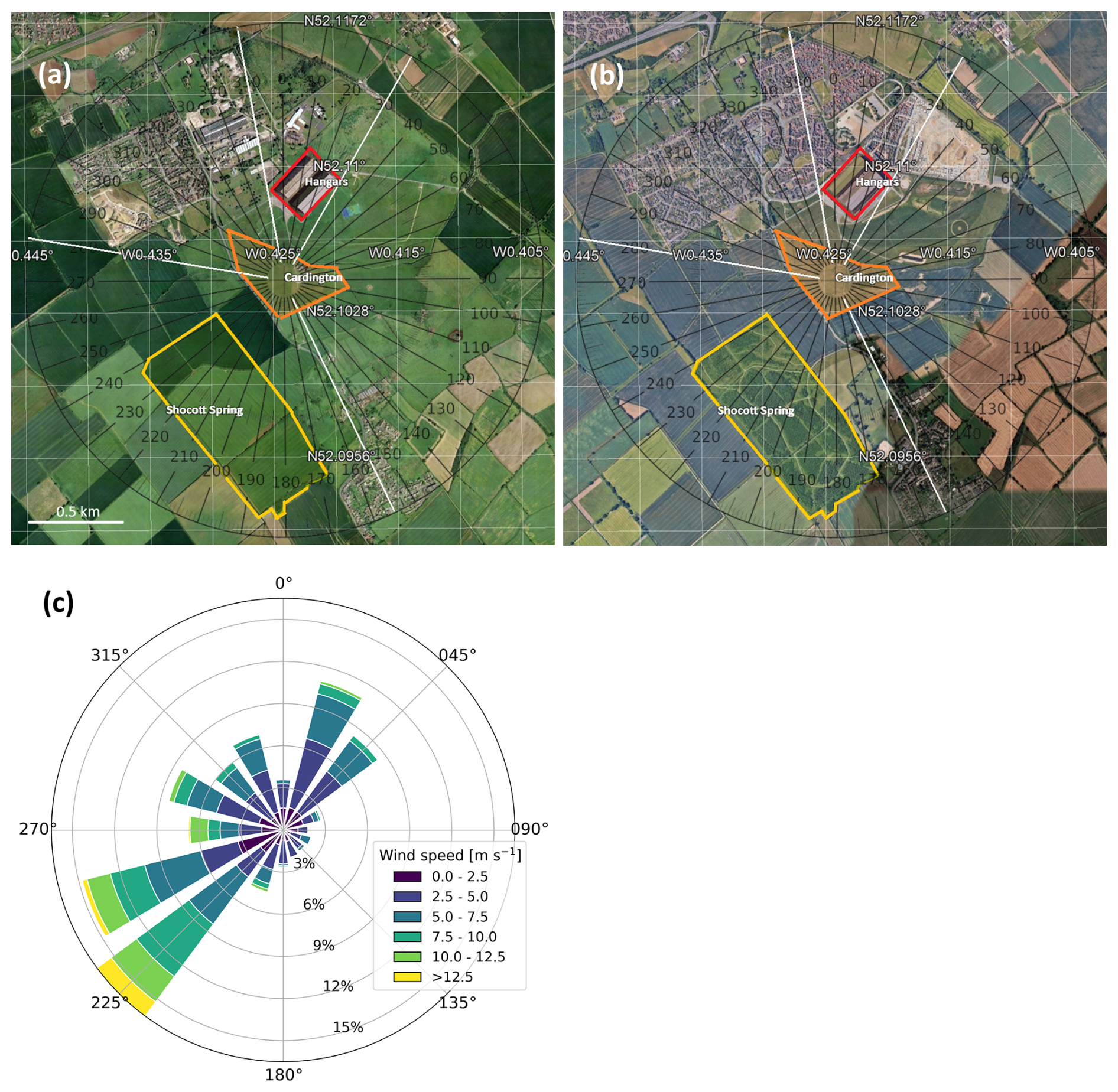 Figure 1Satellite imagery with inlaid magnetic compass of the site location taken in (a) January 2003, and (b) August 2023. The airship hangars (red outline), Cardington site (orange) and Shocott Spring woodland (yellow) are annotated. (c) A wind rose calculated over the years 2005—2009 inclusive. Satellite Images courtesy of © Google Earth 2025 The GeoInformation Group and © 2025 Maxar Technologies.