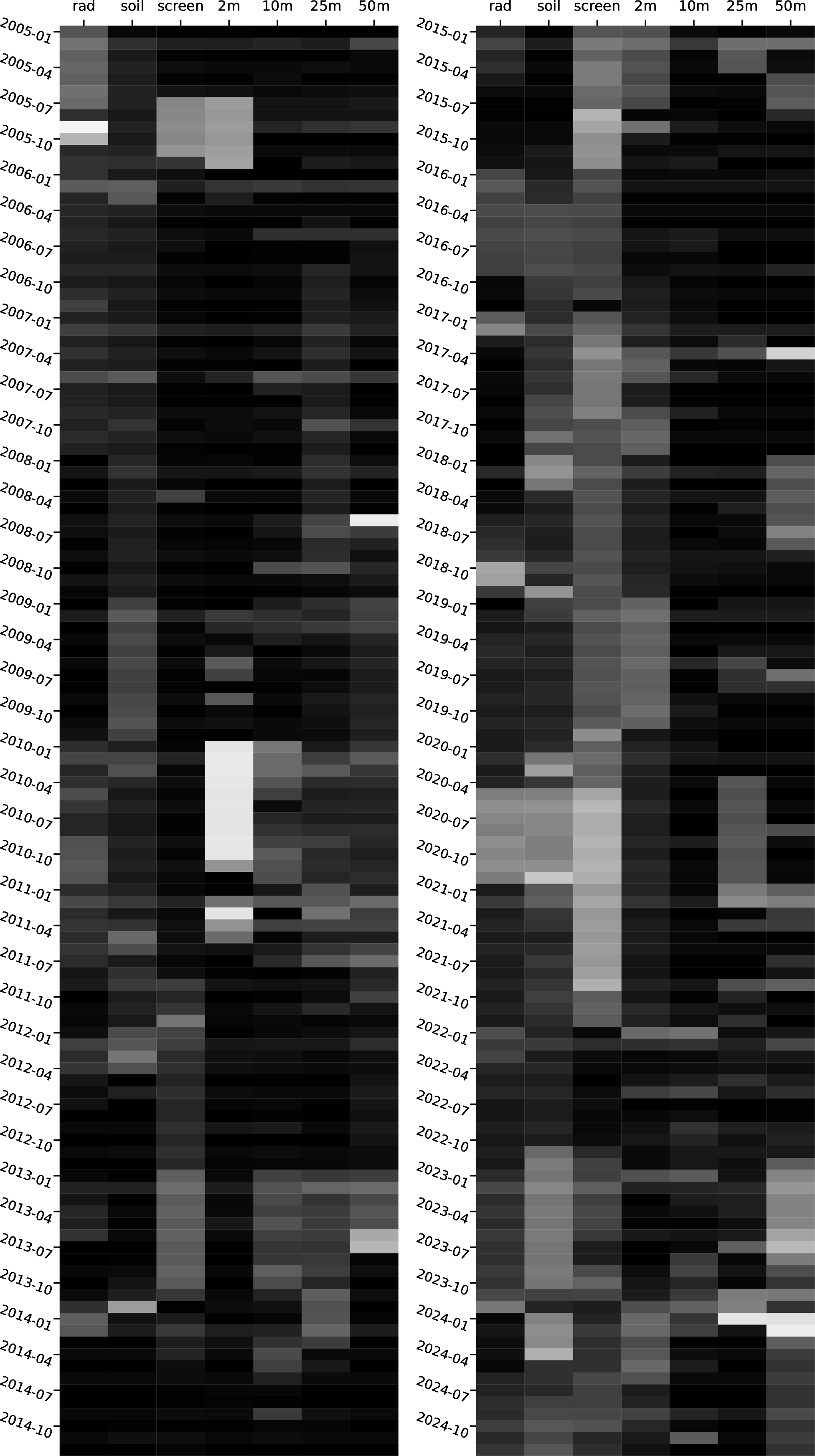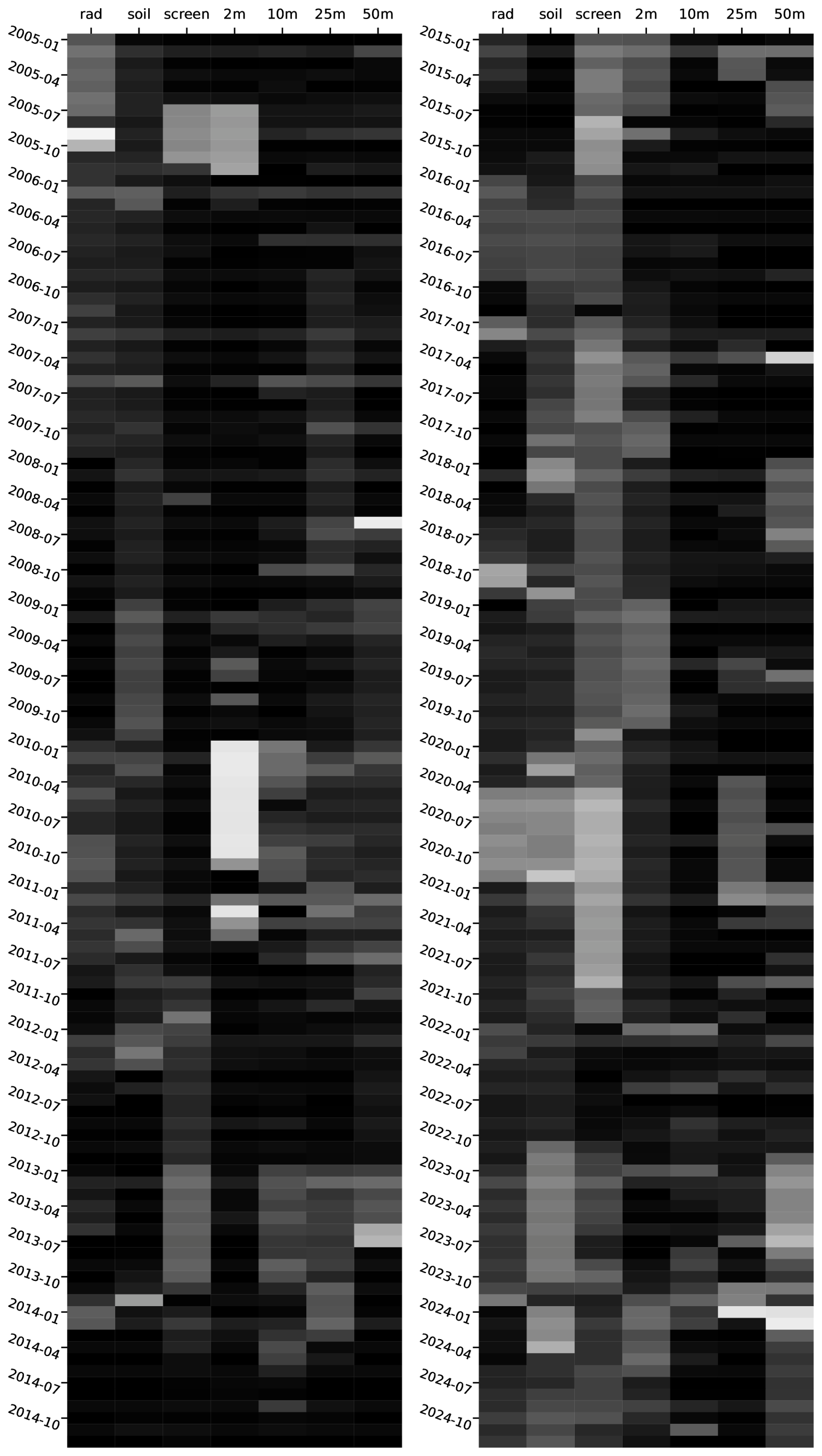 Figure 2Data completeness divided into two 10-year periods for the core surface site instrumentation as split into “50 m”, “25 m”, “10 m”, “2 m”, “screen” (≤ 1.2 m) levels, and also “soil” (all buried subsoil sensors) and “rad” (radiative fluxes) categories. Each bar contains the data availability as a percentage of data not flagged as bad or missing (Table 2), graded on from white (0 %) to black (100 %).
