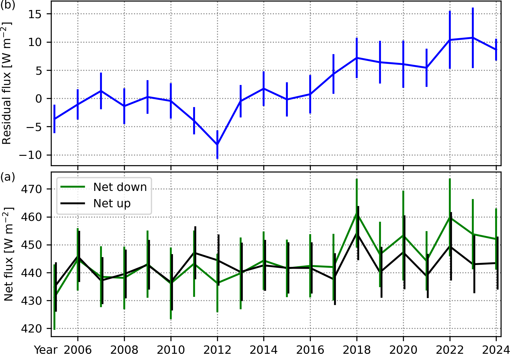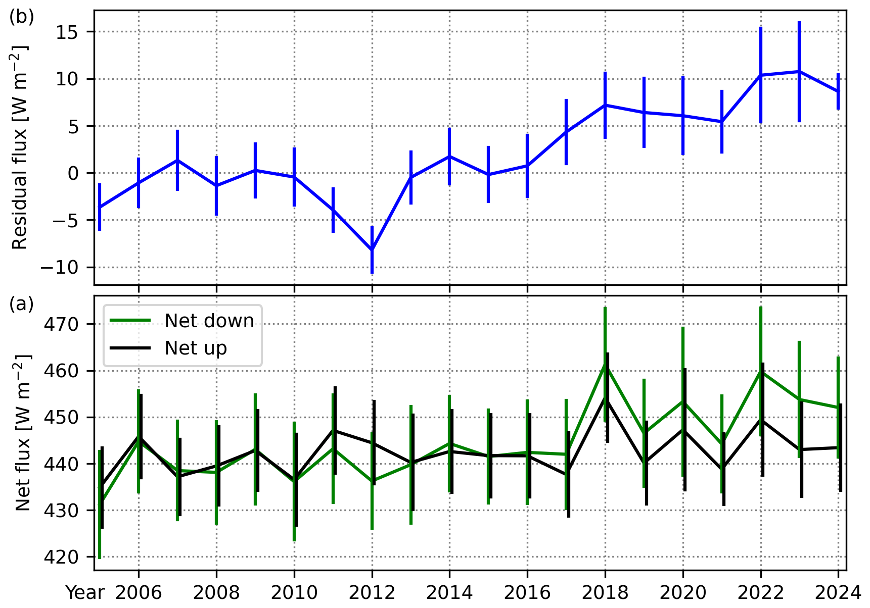 Figure 320-year time series of the annual mean (a) energy balance residual flux, and (b) net down and net up fluxes. Net down = [shortwave irradiance down + longwave irradiance down]; net up = [shortwave irradiance up + longwave irradiance up + sensible heat flux + latent heat flux]. Error bars are 95 % confidence intervals.