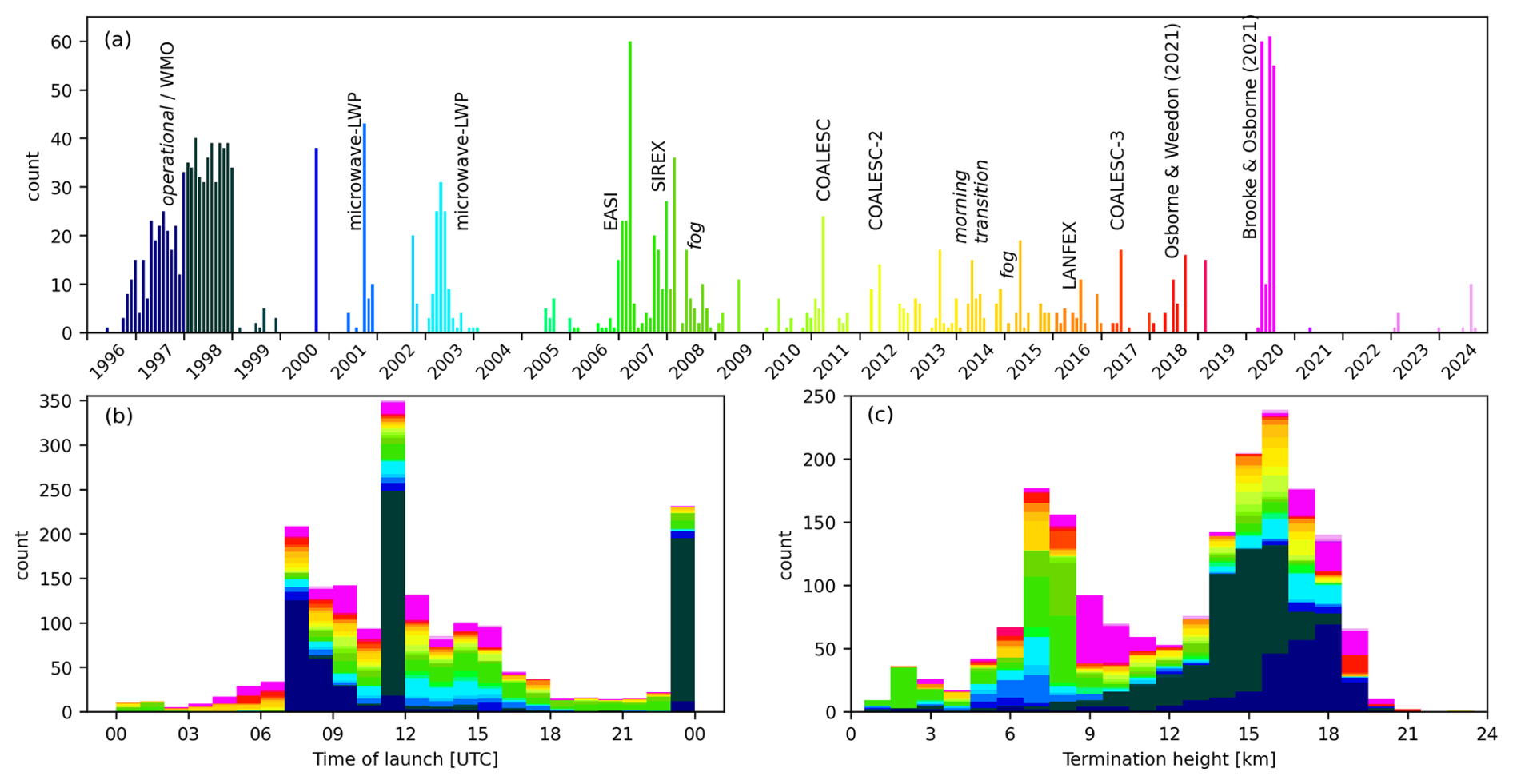 The Biral HSS VPF-730 instrument is used for both the measurement of the visual range through air, and for the determination of present weather (Table S2). This is given in terms of both precipitation type and rate. This instrument consists of an optical transmitter and two receivers. The light source is a flashlamp in the infrared band with a central wavelength of 0.85 µm. One of the receivers measures the forward scatter (45°) of the light caused by atmospheric particles, which gives the atmospheric extinction coefficient. From this the horizontal visual range (visibility) is calculated between 10 and 75 km. The second receiver measures the backscatter off precipitation (or indeed fog and aerosol) particles. The amplitude and duration of the light pulses created by each precipitation particle as they pass through the sample volume are measured, and from this, the particle size and velocities are determined. An algorithm is used to determine the precipitation rate and type. A further method is also used for deducing precipitation type, by measuring the ratio of the backscatter extinction coefficient to the forward scatter, with a ratio above a certain value indicating ice particles. 15 present weather codes (WMO Table 4680: see https://artefacts.ceda.ac.uk/badc_datadocs/surface/code.html for all meteorological codes; last access: 20 February 2026) were generated by the device (a subset of the disdrometer codes as outlined in S6) that cover haze, and various rates of drizzle, rain, snow and hail.