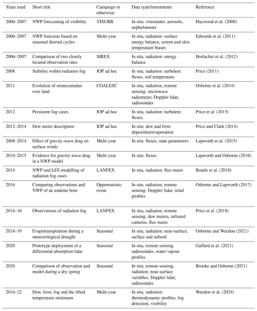 Geographically dispersed ground-based weather data from both professional and private (“citizen science”) automatic weather station sources are crucial to the initialisation and therefore operation of numerical weather prediction (NWP) models (Rawlins et al., 2007; Bell et al., 2015). Additionally, specialist surface sites at locations such as Cabauw in the Netherlands (Bosveld et al., 2020), the SIRTA observatory 20 km southwest of Paris, France (Chiriaco et al., 2018), the three fixed ARM sites of the Atmospheric Measurement Facility (Miller et al., 2016), and Cardington in southern England provide datasets for in-depth research in order to improve the physics within climate and NWP models. This can be achieved either via a statistical approach using long-term data, or special intensive observation periods (IOPs) lasting between hours and a few days, or a combination of both methods. Although a fixed surface site cannot be readily applied to large spatial scales, except via remote sensing with radars and lidars, it allows analysis over a wide range of time scales from minutes (e.g. fog development) to months or years (e.g. changes in deep soil moisture content). This allows for model forecast evaluation across a range of time scales as well as the development of parametrizations, whether these be full parametrizations or partially resolving such as within the turbulent grey zone (Wyngaard, 2004).