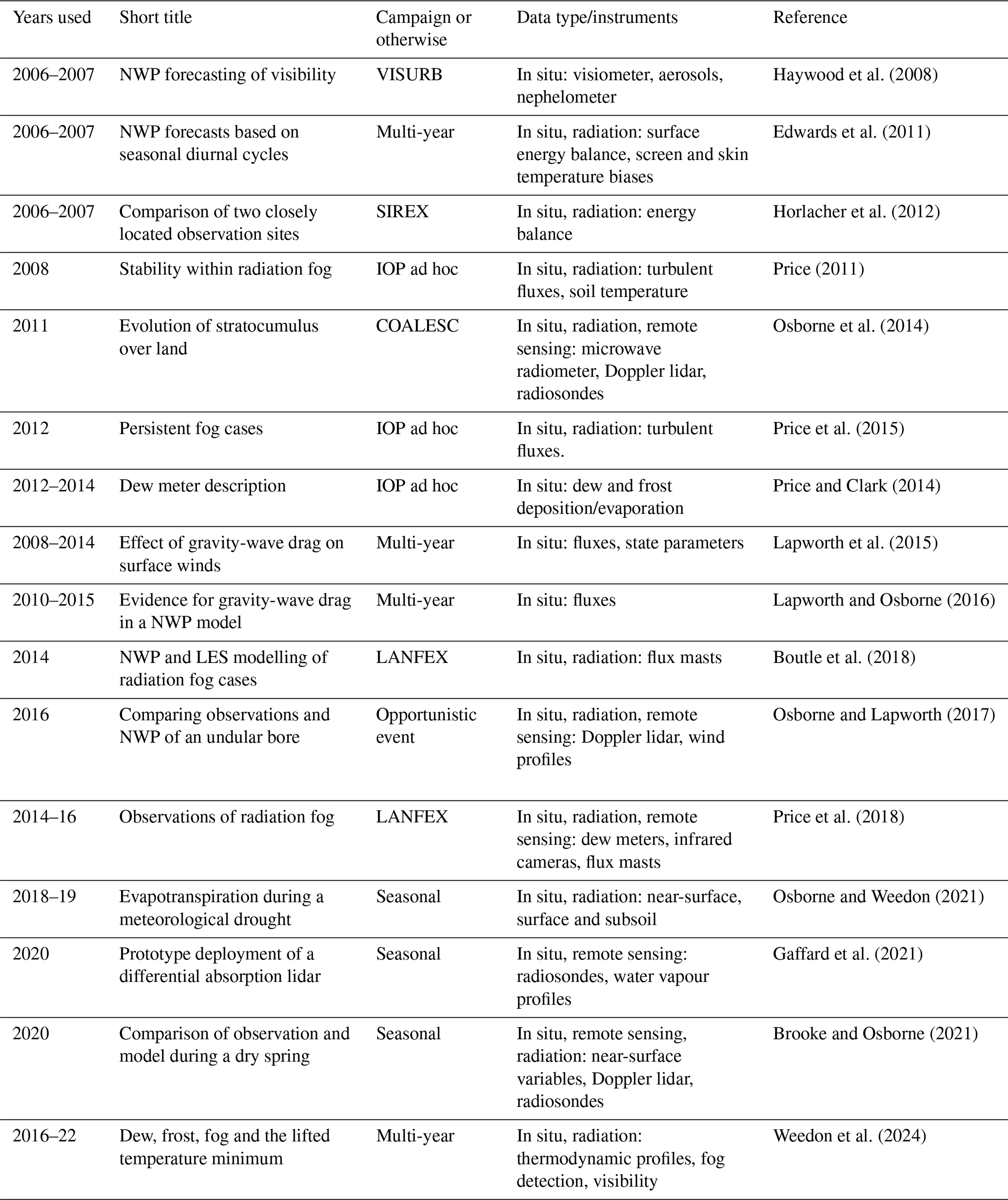 Cardington was established for both model evaluation (e.g. Price et al., 2018) and improvement of the parametrisations of processes in the Met Office LSM and regional NWP schemes (Boutle et al., 2014). Table 1 shows an illustrative list of published research from the past 20 years that focuses on site data. These projects tended to use a combination of both the continuous core meteorological dataset and more specialist instruments that were installed as remote-sensing technology allowed in-situ sensors to be augmented. Studies of the stable nighttime boundary layer (Horlacher et al., 2012), the morning and evening transitions (Angevine et al., 2020), and visibility (Haywood et al., 2008) have all been carried out over the past two decades. The perennial problem of fog forecasting was a recurring research theme at Cardington that has led to improvements in both LES and NWP modelling. Boutle et al. (2018) showed that attention needs to be paid to simulations of weak turbulence and low supersaturations that activate low concentrations of fog droplets. If this activation can be modelled using explicit aerosol data, then the evolution of optically thin, stable fog into thick, unstable fog can be better captured.