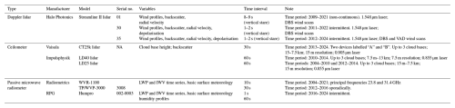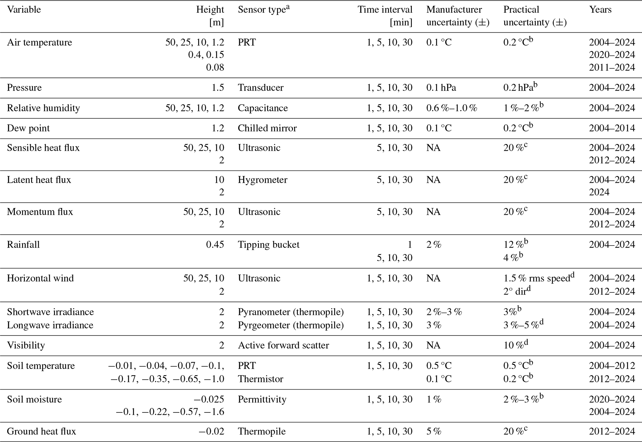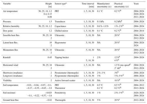 Table 3Important core meteorological, radiation and subsoil variables with deployment heights, processed time interval and measurement uncertainties. a Further Details on the various instruments and their period of deployment are contained within Tables S1 (core meteorology), S2 (aerosol and visibility), S3 (radiation) and S4 (subsoil). b In-house calibrations. c From Cardington field evaluation. d Accepted error from the literature. NA: not available.