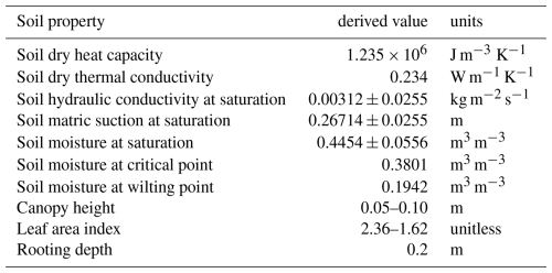 The soils at the site are described geologically as loamy solifluction deposits over river valley gravels. Impervious Oxford Clay Formation underlies the whole area at an unknown depth. Soil sample analysis (Burton, 1999) shows that the topsoil (0–20 cm) is clay loam with 3 %–4 % intimate humus (organic matter), depths between 20 and 66 cm is medium clay loam (roughly equal fractions of clay, sand and soil), whilst deeper soil down to 170 cm is sandy gravel with 70 %–80 % sand content though locally there is chalky diamictite (boulder clay). The soil composition partially controls water infiltration, percolation, soil moisture content and evaporation. The vegetation canopy also affects infiltration and the plant water uptake – itself dependent on the moisture content within the rooting zone – controls transpiration. The exchange of water vapour between the soil and atmosphere is often a poorly constrained mechanism of LSMs and therefore is a weak link in the simulated hydrological cycle. Soil hydraulic properties can be derived from the observed soil composition, and such soil properties can be used to initialise LSMs; this is discussed in more detail in Sect. 4. A small stream runs through the research site which was situated to the north of all the instrumentation. Water table depth data (from two locations on the site labelled as “south” and “west”) shows that the hydraulic gradient, and hence the flow of subsurface water, is towards the stream despite the surface of the site being essentially flat.