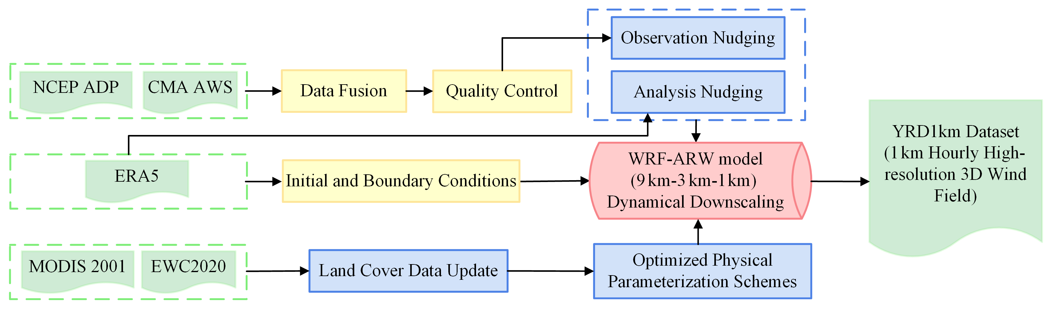 This study developed and rigorously validated YRD1km, a high-resolution (1 km, hourly) 3D wind field dataset over the YRD region. The dataset was generated through dynamical downscaling of ERA5 reanalysis data using a customized WRF model configuration. It was further refined by integrating multi-source observational nudging and updated land use representations to improve surface parameterization.